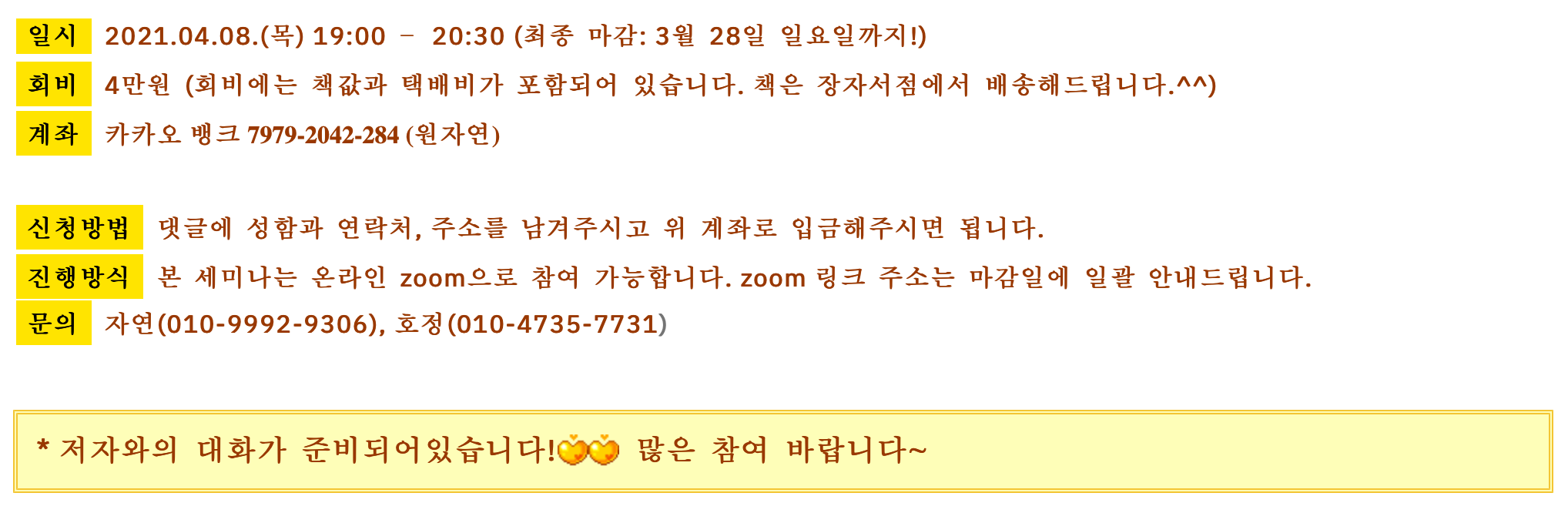 | 시작부터 발제까지!『세미나책』북펀드에 참여하세요 (1) | 2021.04.27 |