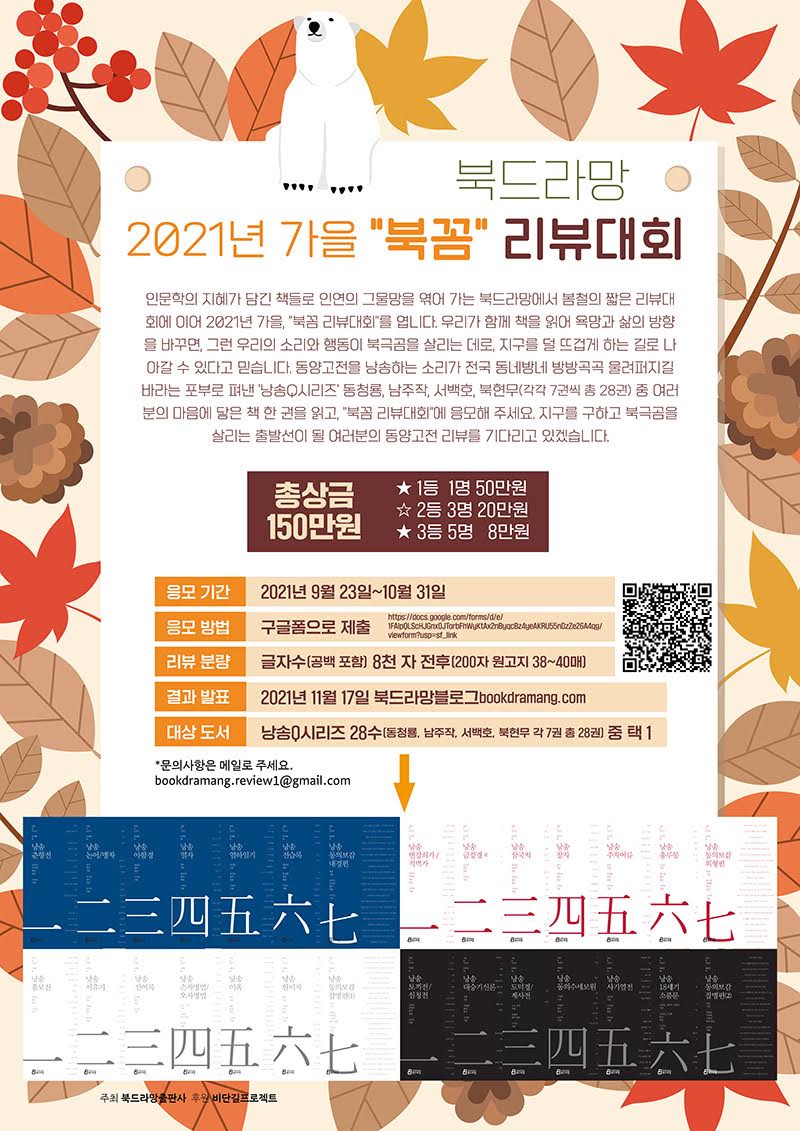 | 여러분의 참가를 기다리고 있습니다-가을맞이 북드라망 ‘북꼼 리뷰대회’ (0) | 2021.10.29 |