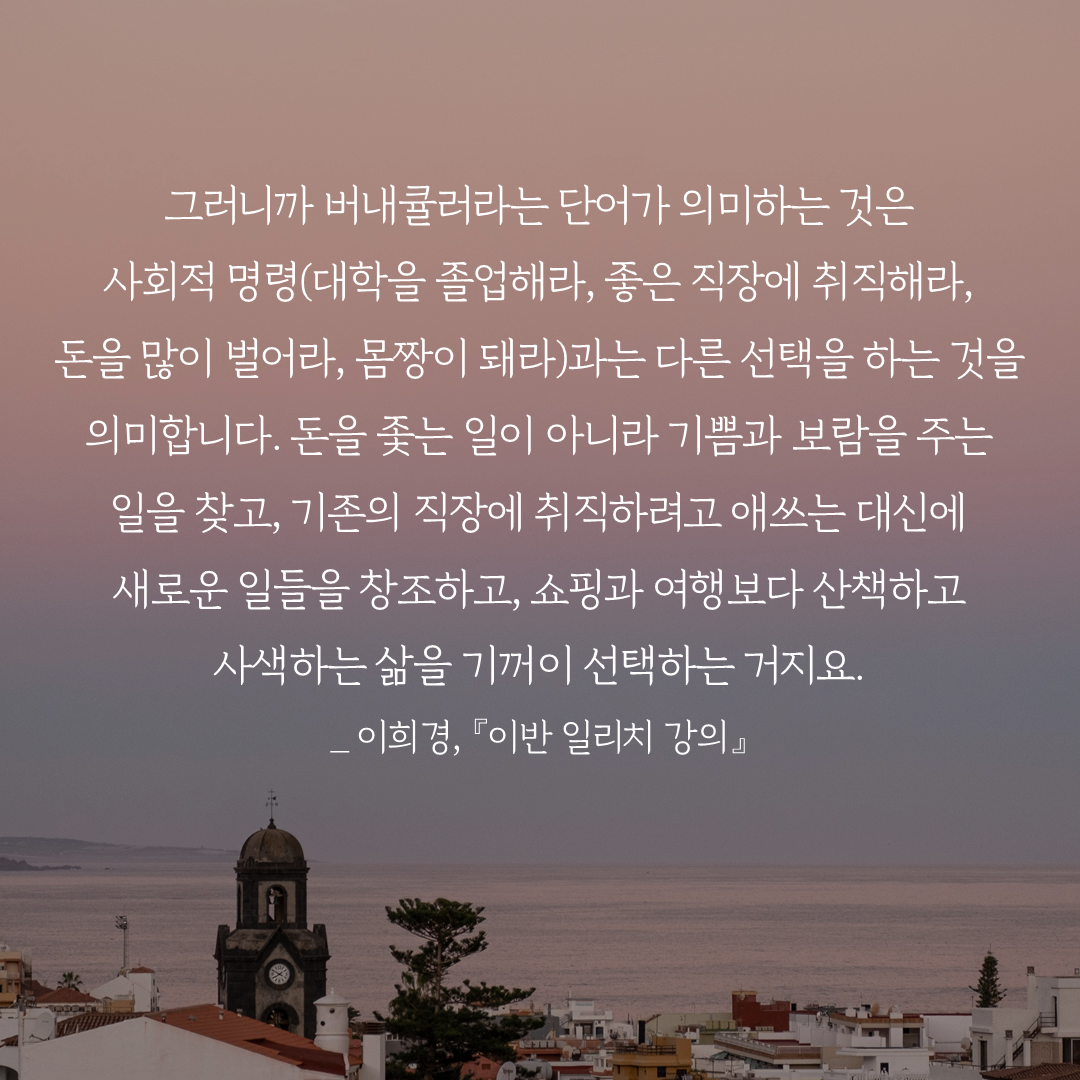 그렇다면 대체 어떻게 하란 말인가? 다른 대안이 없지 않은가? 막막해지니 또다시 누군가의 해결책을 찾고 있는 나를 발견하게 된다. 아, 이 끊임없는 의존성이란! 하지만 결국, 내 삶을 살아내는 건 ‘나라는 존재’다. 내 삶을 내가 선택할 것. 나에게 “기쁨과 보람을 주는 일”을 찾을 것. 이반 일리치가 주장하는 것도 그것이다. “우리 인간은 호모사피엔스사피엔스, 곧 ‘생각하는 인간’이기 때문에 우리에게 가장 적절한 기술이 무엇인지 알 수 있습니다. (중략) 그리고 우리에게는 거기에 맞춰서 필요한 도구를 만들어 낼 수 있는 지성이 있습니다.”(같은 책, 54쪽) 이 문장을 읽으며 약간의 기분 좋은 두근거림이 찾아왔다. 호모사피엔스사피엔스인 나도 분명 나에게 가장 좋은 삶을 생각해 낼 수 있으며 곧 창조할 수 있을 것이다. 버내큘러한 삶! 우리는 학교에서, 아니 세상을 살아가며 이 태도를 배워야 하는 것이 아닐까?