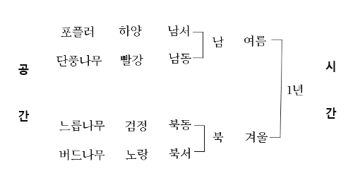 이 분류의 핵심은 우주 자연을 범주, 원소, 종, 수로 나누는 데에 있습니다. 일단 신화적 사고를 하는 사람들은 우주를 크게는 여름과 겨울로 나눕니다. 그 안에서 다시 동서남북의 방위로 구획하고, 또 그 아래에서 세부 방위, 그 방위에 해당하는 색깔 등을 나눕니다. 레비 스트로스는 그 어떤 인간도 우주 자연을 분류하고 분석하는 데에는 이와 같은 차등적, 계열적, 종합적인 분류의 틀을 사용한다고 보았습니다. 그런 다음 구체적인 기호의 선별 작업이 이루어지는데요, 포플러는 하얀색이므로 남서 방향에 둘 수 있으며, 남쪽 계열에 속하기에 여름 식물이 된다는 식입니다. 즉 기호 선택은 전체 틀에 바탕을 둡니다.