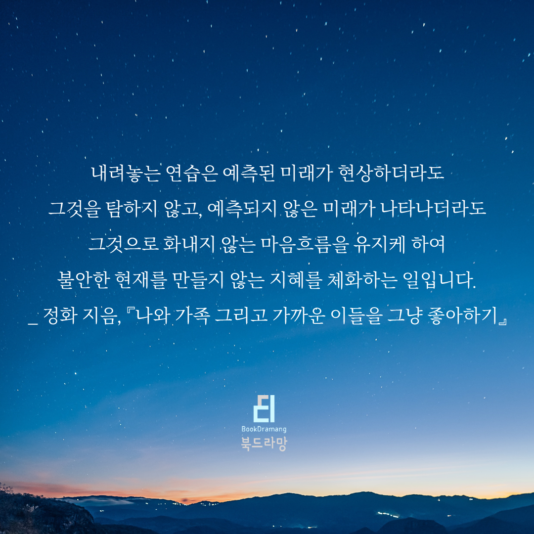 내려놓는 연습은 예측된 미래가 현상하더라도 그것을 탐하지 않고, 예측되지 않은 미래가 나타나더라도 그것으로 화내지 않는 마음흐름을 유지케 하여 불안한 현재를 만들지 않는 지혜를 체화하는 일입니다. 일어나는 일들이 마음에 드느냐 안드느냐를 가지고 힘들어하는 것은 사건들이 자신이 예측한 대로 흘러가기를 바라는 마음이 자리 잡고 있기 때문일 것입니다. 이 마음은 사건의 흐름에 대한 무지를 상속받고 상속하는 마음입니다. 그러므로 그와 같은 바람과 판단이 삶을 괴롭게 한다는 것을 사무치게 알아차려야 집착을 내려놓을 수 있는 단초를 마련할 수 있습니다. (『나와 가족 그리고 가까운 이들을 그냥 좋아하기』, <자비심은 어떻게 길러야 할까?> 중에서, 정화 지음, 북드라망, 56쪽)