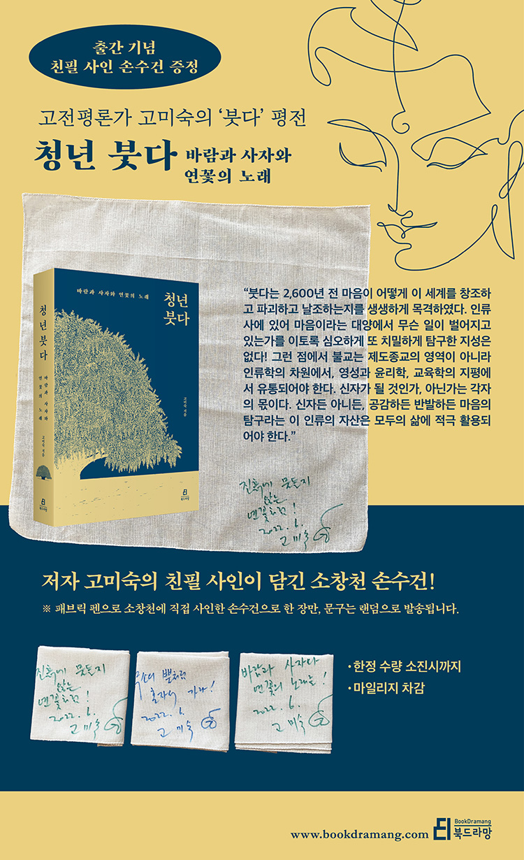 먼저, 인터넷서점에서 지금 『청년 붓다』를 사시면 고미숙 선생님께서 패브릭펜으로 한 자 한 자 꾹꾹 눌러서 사인하신 소창천 손수건을 받으실 수 있습니다.(한정 수량, 마일리지 차감)