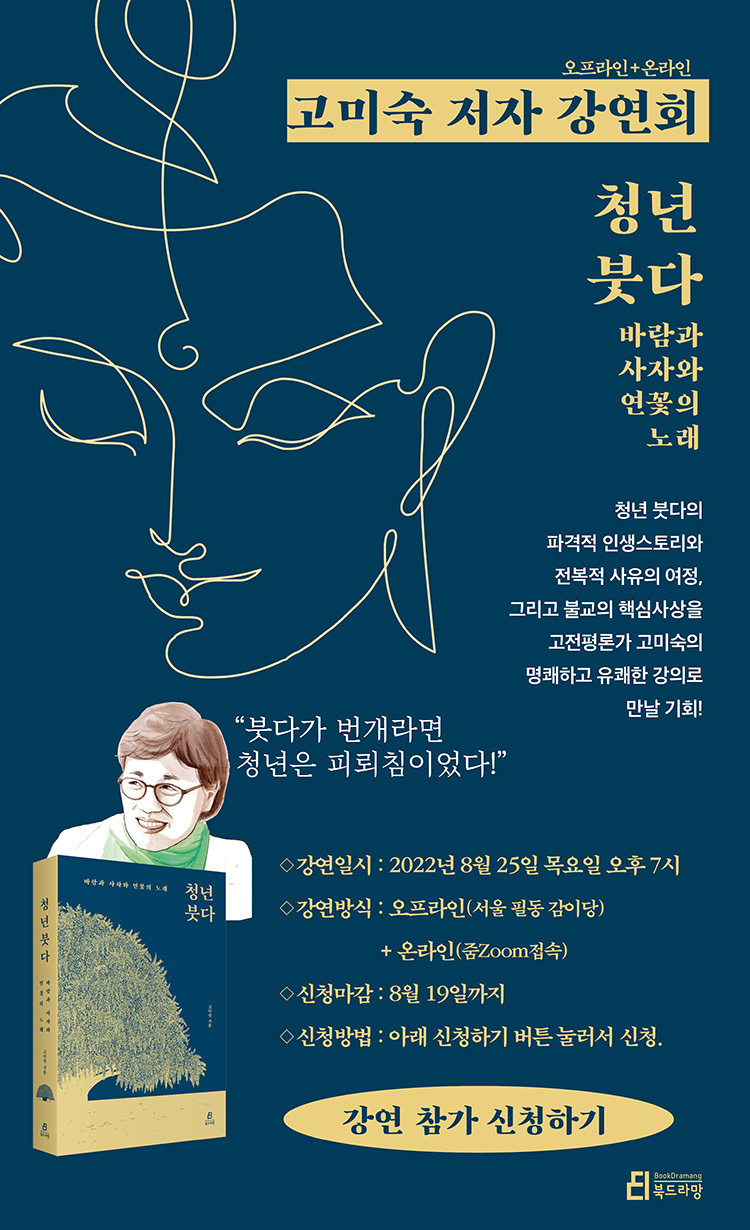 두번째 이벤트는 저자강연회입니다. 고미숙 샘 강의를 직접 들을 기회! 붓다와 고미숙 샘의 만남은 어떻게 이루어졌는지, 생생하게 현장에서 확인하시기 바랍니다. 강연회는 코로나 등의 상황이 큰 변동이 없는 한 오프라인과 온라인 병행해서 진행될 예정입니다. 강연회일은 8월 25일입니다. 신청하실 분들은 아래 링크를 눌러 주세요.