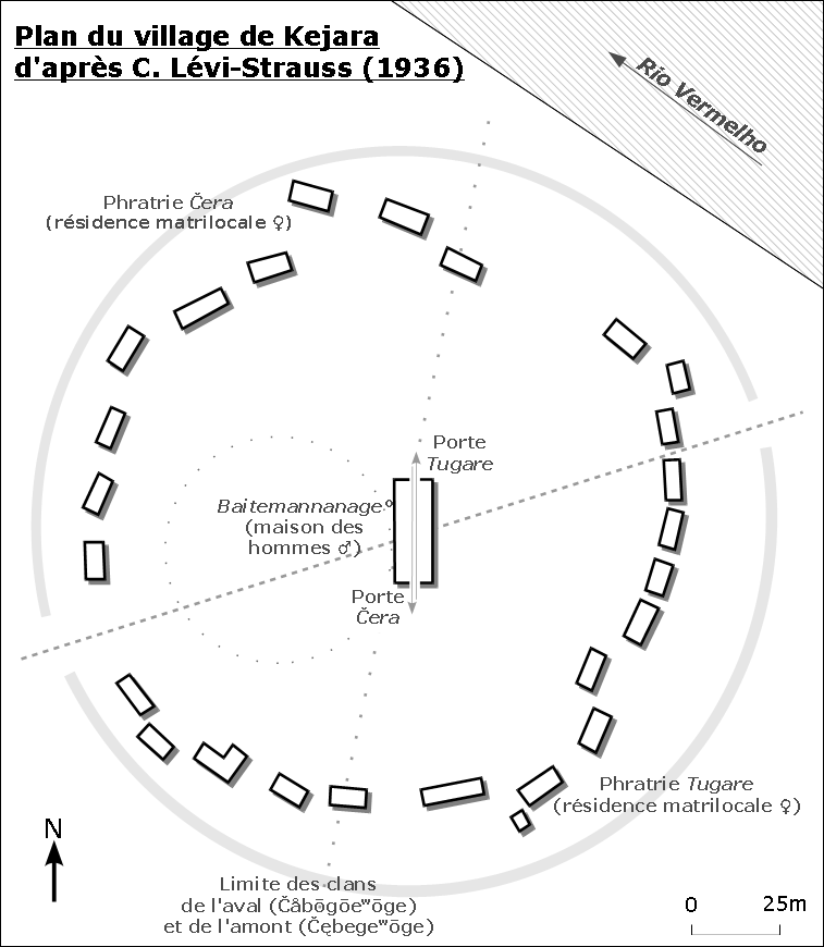 강은 동쪽에서 서쪽으로 흐릅니다. 부락민들은 수직으로 가로지르는 하나의 선에 의해 두 개의 집단으로 나누어지는데, 이론적으로 강과 평행을 이룹니다. 북쪽에 사는 사람들은 ‘세라’이며 남쪽 사람들은 ‘투가레’입니다. 세라는 ‘약한’을 뜻하고 ‘투가레’는 ‘강한’을 뜻합니다. 마을 사람들은 모두 어머니의 집단에 영구히 귀속되고, 반드시 다른 집단과 결합해야 합니다. 만약 내 어머니가 투가레이면 나는 죽을 때까지 투가레이며 배우자는 반드시 세라여야 합니다(cf. 족외혼의 흔적으로서 동화인류학). 여자들이 어머니의 집을 상속받으니 모계제입니다. 보로로족의 남자는 강과 이론적으로 평행한 이 선을 넘는 것으로 어른이 됩니다.