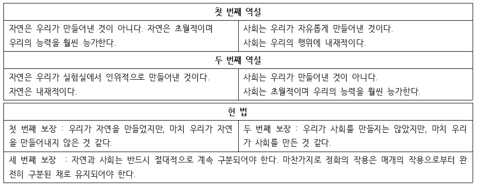 라투르는 초월성과 내재성의 차원에서 홉스와 보일의 논리가 어떻게 모순적인지를 설명합니다. 여기서 초월성이란 자연과 사회 각각을 지배하는 논리가 자연과 사회 그 바깥에 있다는 의미이고요, 내재적이라 함은 그 논리가 자연 안에 사회 안에 있다는 의미입니다. 라투르는 보일과 홉스가 펼친 논의에 깔린 논리를 ‘헌법(constitution)’이라고 표현하는데요, 사법에서 말하는 헌법 개념보다는 큰 것으로 ‘구성의 논리’라고 할 수 있습니다. 아래 표의 왼쪽은 보일의 실험이 품고 있었던 전제들입니다. 오른쪽은 홉스의 정치학의 전제들이고요. 이 둘을 순서대로 붙여 놓았을 때, 각각의 전제들이 갖는 모순과 억지가 드러납니다.