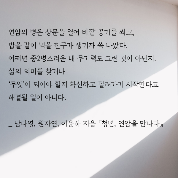 여기, 조금 다른 삶을 사는 청년들이 있습니다. 바로 고전과 만나 자신의 일상을 바꾸는 청년들이죠. 그 중심에는 텍스트, 즉 고전이 있습니다. 우리가 흔히 알고 있는 성공의 길로부터 조금 벗어난 길을 택한 청년들. 기존의 방식이 아닌 또 다른 삶의 방법이 있다는 사실만으로도 어쩌면 숨통이 트일지도 모르겠습니다.(하하 제가 그랬거든요!) 아니면, 부모님께서 먼저 읽으셔도 참 좋겠다는 생각이 듭니다!