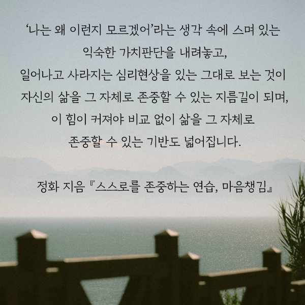 아무래도 연휴 동안 혼자 지내는 시간이 많은 분들도 계시지요. 그럴 때, 나를 충전하기에 좋은 책입니다. 바로 뇌과학과 진화생물학을 바탕으로 불교를 설명해주시는 정화스님의 책입니다. ‘결핍이란 무엇인가’, ‘공부와 글쓰기란 무엇인가’, ‘왜 생각길을 바꿔야 하는가’, ‘차이를 긍정한다는 것은 무엇인가’ 등등의 여러 주제로 스님께서 이야기 해주십니다. 스님의 말씀을 통해 스스로를 탓하지 않는 방법을 배워보면 좋을 듯합니다.