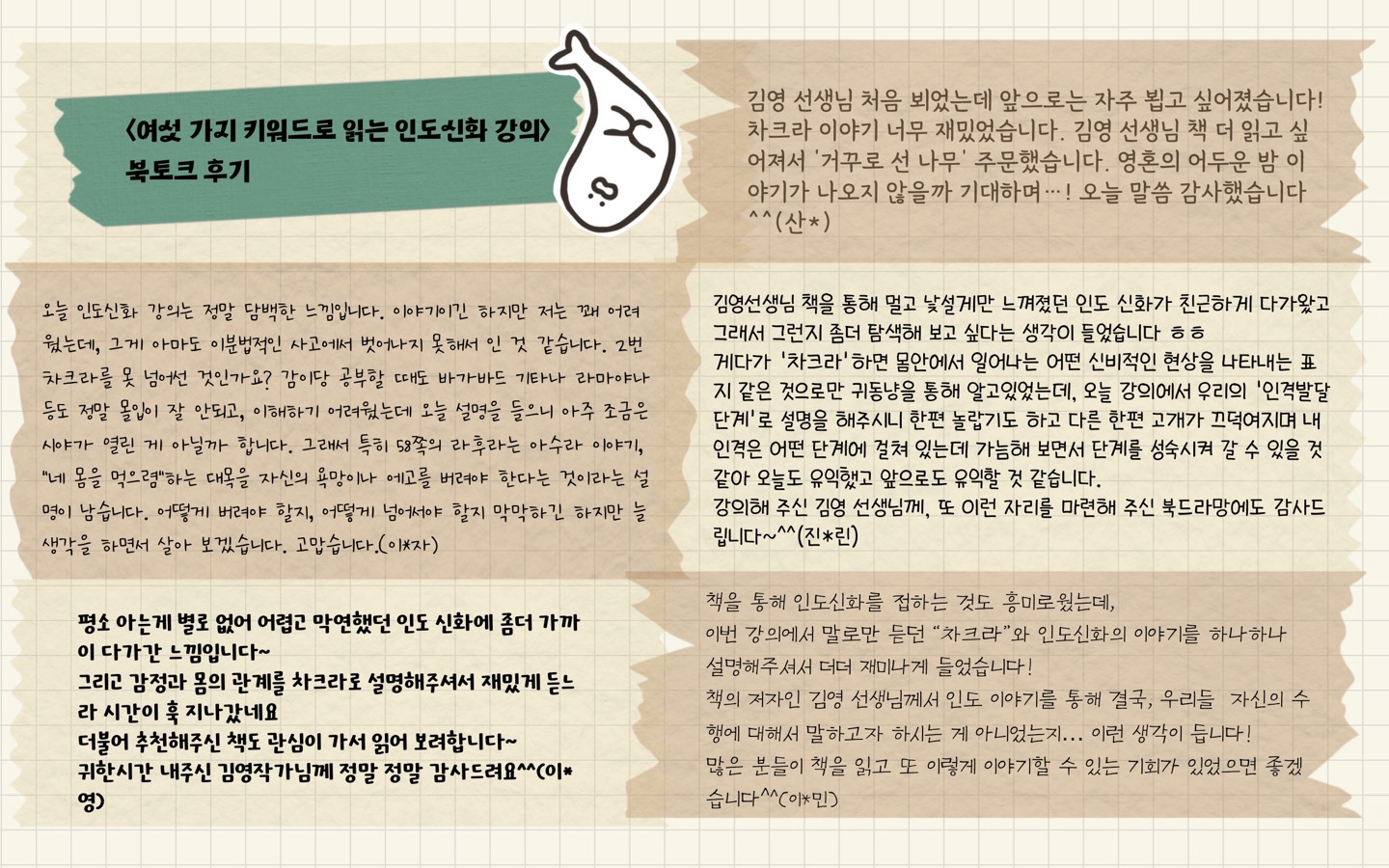 본격적인 강의에 앞서 선생님께서는 ‘여러분 인생에서 가장 중요한 게 무엇이냐’는 질문을 던지셨었는데요, 자신이 가장 소중하게 여기는 것을 통해서 본인이 어느 차크라의 단계, 인격 발달의 어느 단계에 와 있느냐라는 것을 한번 가늠해 보라는 뜻이었습니다. 이 질문과 선생님께서 설명해 주신 차크라 이야기를 가지고 『여섯 가지 키워드로 읽는 인도신화 강의』를 다시 읽으면서 여러분들만의 키워드를 뽑아 보시는 건 어떨까요? 그렇게 하시면 이 시간에 함께하시지 못한 아쉬움을 조금은 벌충하실 수 있을 것 같습니다.^^ 다음엔 꼭 함께하기로 해요!^^