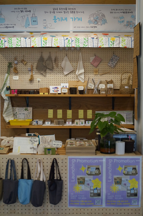 2009년 9월 출범한 ‘마을에서 만나는 인문학공간 - 문탁네트워크’는 십여 년간의 실험과 진화 끝에, 2021년 초 ‘문탁네트워크’, ‘파지사유’, ‘인문약방’으로 분화되었다. 파지사유의 풀네임은 에코실험실 파지사유다. 이곳에 들어서면 가장 먼저 용기내 가게가 눈에 띈다. 벽면에 층층이 쌓인 나무 선반 위로 자투리 가죽으로 만든 필통, 커피 찌꺼기로 만든 화분, 스텐 빨대, 대나무 칫솔, 천연 수세미, 손작업장 자누리에서 만든 다양한 종류의 비누가 보인다. 그 위로는 코코넛으로 만든 세척 솔, 니트 수세미, 소창 손수건이 걸려있고 그 아래로는 자누리 비누 선물 세트와 자투리 천으로 만든 에코백이 카운터에 놓여 있다.