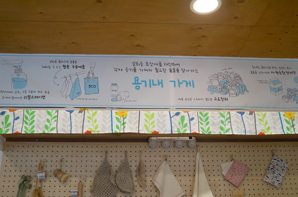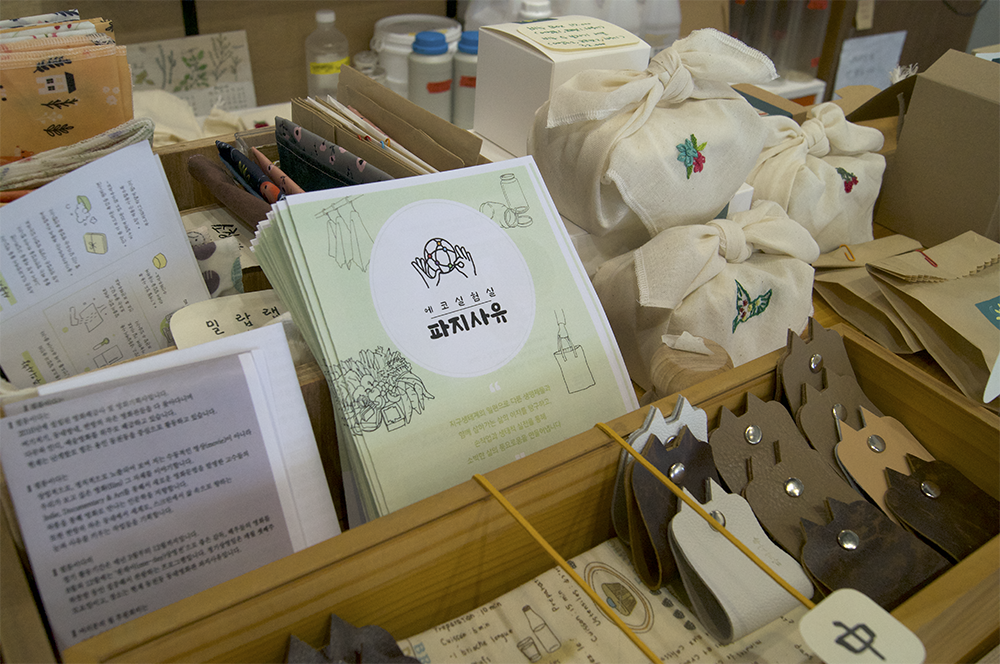 2009년 9월 출범한 ‘마을에서 만나는 인문학공간 - 문탁네트워크’는 십여 년간의 실험과 진화 끝에, 2021년 초 ‘문탁네트워크’, ‘파지사유’, ‘인문약방’으로 분화되었다. 파지사유의 풀네임은 에코실험실 파지사유다. 이곳에 들어서면 가장 먼저 용기내 가게가 눈에 띈다. 벽면에 층층이 쌓인 나무 선반 위로 자투리 가죽으로 만든 필통, 커피 찌꺼기로 만든 화분, 스텐 빨대, 대나무 칫솔, 천연 수세미, 손작업장 자누리에서 만든 다양한 종류의 비누가 보인다. 그 위로는 코코넛으로 만든 세척 솔, 니트 수세미, 소창 손수건이 걸려있고 그 아래로는 자누리 비누 선물 세트와 자투리 천으로 만든 에코백이 카운터에 놓여 있다.
