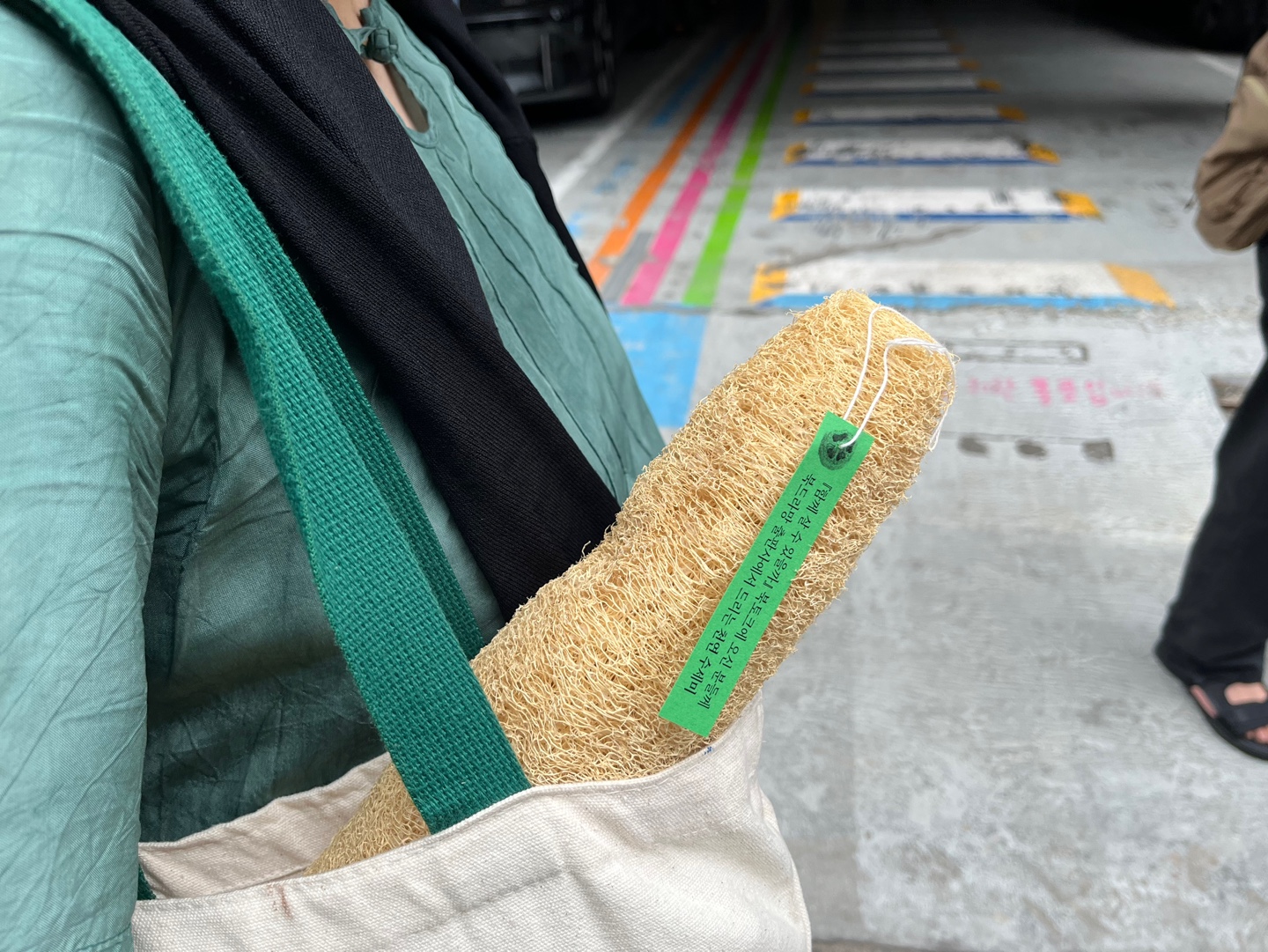 오랜만에 독자 님들을 직접 뵙는 만큼 주말에 귀한 시간을 내서 와주신 분들께 어떤 선물을 드릴까 고민하다가 <그린오큐파이>의 다마스소분상점 프로젝트 때 많은 호응을 얻은 천연수세미를 드리면 좋겠다고 생각했습니다. 생각보다... 수세미가 크더라고요...^^;; 여기에 북드라망의 행사에서 나눠드리는 선물이라는 표시를 어떻게 해야 할까 고민하다가... 저희는 실꼬매기를 했습니다.^^ 당일에 이 선물을 받은 독자님들은 바게트빵 같다는 말씀을 해주셨어요. 독자님들 손에 간 수세미들이 독자님 댁 그릇들을 반짝반짝 빛내고 있으리라 생각합니다.