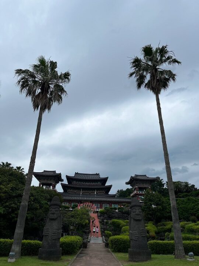 오름에서 내려온 후 이타미 준 건축가가 설계했다는 방주교회로 이동했다. 노아의 방주를 모티브로 한 교회는 인공 수조를 조성해 물 위에 떠 있는 듯한 분위기를 연출하고 있었다. 계속 비가 오락가락해서 수조 위로 빗방울이 떨어졌다. 한 친구가 그 모습을 포착하며 찍는 영상의 모델이 되어 수조에 놓여있는 징검다리를 오락가락했다. 나중에 확인한 영상을 보니 뒤뚱이며 움직이는 모습이 가관이었다. 교회를 봤으니 절도 가보자며 근처에 있다는 약천사까지 둘러보았다. 대웅전인 대적광전은 아파트 십 층 가량 되는 높이로 삼층 지붕으로 이루어져 있었다. 대웅전 앞에 서면 서귀포 앞바다가 훤히 내다보였다. 약수가 있다는 말에 찾으러 나선 친구들을 기다리며 대웅전 앞에 있는 의자에서 멍 때리는 시간도 좋았다.