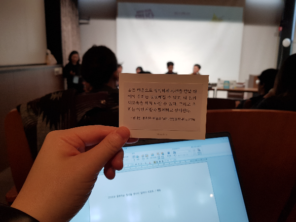 "어? 이게 뭐지?" 이름표를 받고 자리에 앉았을 때 발견한 건, 이름표 뒤에 꽂혀있는 자그마한 카드였습니다. 거기에는 오늘 주인공들의 책에서 발췌한 문장이 랜덤으로 들어 있었습니다. 바로 문장선물! 정성어린 선물을 발견하자 기분이 절로 좋아졌습니다. 제가 받은 문장 선물은 <청년, 연암을 만나다>의 한 구절인데요, 정직함과 떳떳함을 말하고 있습니다. 어쩐지 운명처럼 다가오는 문장이네요^^