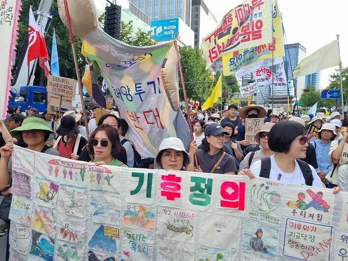 본집회 후반부 ‘바람이 불어오는 곳’이라는 노래를 개사해서 부르는 합창의 순서가 되었다. 내가 좋아하는 노래였다. 가사를 찾아서 따라 부르는데 목청이 트이지 않아 몇 소절도 못 부르고 켁켁거렸다. 탁 트인 집회에서 목청껏 부르는 노래야말로 우리를 하나로 만드는 순간이거늘, 집회를 즐길 몸이 못 되어서 아쉬웠다. 이럴 때를 대비해 코인 노래방이 필요한 거였다. “기후위기 한복판에서 모두가 존엄하게 살아갈 새로운 길, 기후위기를 넘어 다른 세상을 여는 새로운 길, 그 길로 우리 함께 행진합시다.”라고 선언하는 것을 끝으로 집회가 끝나고 행진이 시작되었다.