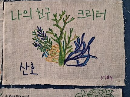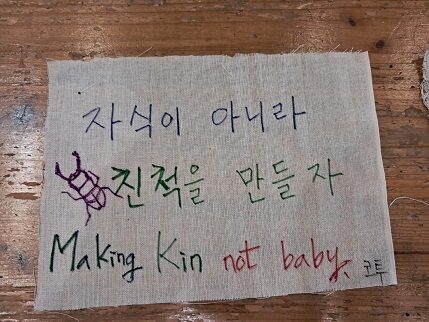 작년에 이어 올해는 9월 23일에 기후정의행진이 있다는 소식이 공동체 홈페이지에 올라왔다. 올해 행진에는 소창조각보로 플랭카드를 만들자는 제안도 함께였다. 토요일 오전에 세미나를 하고 시청역까지 가면 본집회는 참여할 수 있는 일정이었다. 행진 2주전, 파지사유 벽면이 하얗게 칠해졌고, 푸른 빛깔로 물들인 커다란 천이 걸렸다. 그 위에 에코실험실에서 활동하는 친구들이 소창조각보에 메시지를 담아 한 장씩 붙여나갔다. 이번 행진의 슬로건인 ‘위기를 넘는 우리의 힘’이라던가 문어, 고래, 녹아내리는 빙하도 보였다. 세미나를 하러 온 친구들을 불러다 소창조각을 내밀면 대부분 진지하게 뭔가를 그리거나 썼다. 내가 속해 있는 ‘양생프로젝트세미나’팀은 요즘 한창 읽고 있는 도나 해러웨이의 책에서 따온 문장들로 조각보를 채웠다. ‘우리는 모두 크리터(미생물, 식물, 동물, 인간과 비인간, 그리고 때로는 기계까지 포함하는 잡다한 것들)다’ ‘자식이 아니라 친척을 만들자’ ‘우리는 모두 퇴비다’ 등이었다.