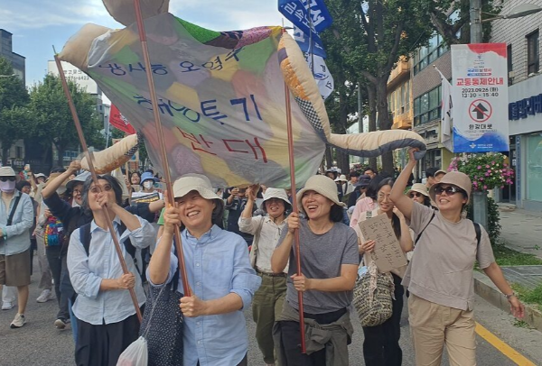 2018년 그레타 툰베리와 ‘미래를 위한 금요일’의 기후를 위한 등교 거부 시위, 그리고 이듬해 2019 유엔 기후행동 정상회의에 맞춰 일주일 동안 진행된 기후파업시위를 계기로 9월 기후행동의 달이 만들어졌다고 한다. 이후 세계 곳곳에서 기후정의를 외치는 다양한 활동이 펼쳐졌고, 코로나로 주춤했던 행진도 재개되어 2022년에 이어 올해도 세계 곳곳에서 기후정의행진이 있었다. 나도 작년에 이어 두 번째로 기후정의행진에 참여했다. 일상의 리듬에서 벗어나 자연에 스미는 감각을 회복하는 걷기나, 몸의 속도에 맞춰 마음도 거닐게 했던 걷기에서 나아가, 사회적 의제로서 기후 정의를 위한 행진이라는 걷기까지 이르렀다. 행진으로, 시위로 무엇을 바꿀 수 있느냐는 비관에서 벗어나기 위해서라도 움직여야 했다.