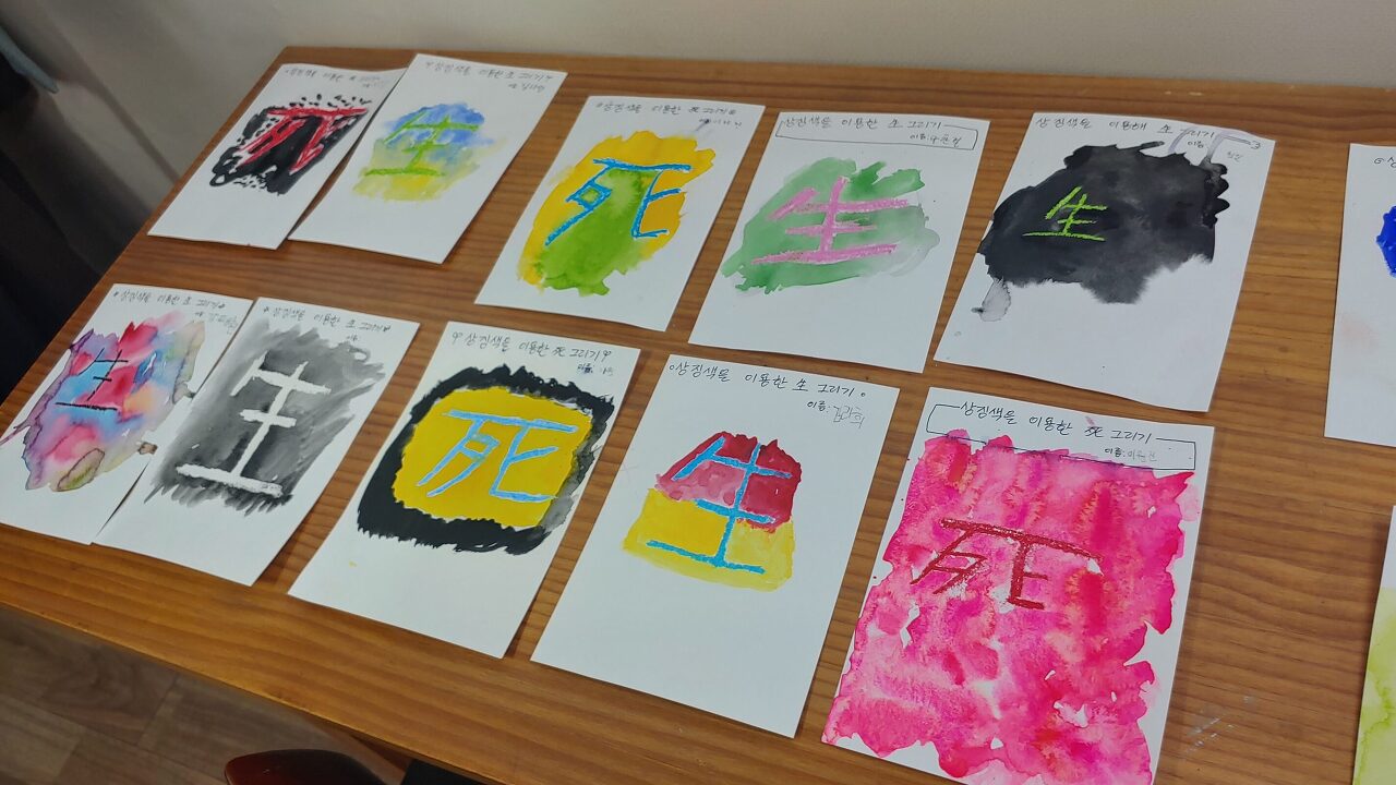 누군지도 알수 없는 뼈조각이 죽음이라는 글자가 되고, 푸릇한 싹이 생명을 의미하게 되었다. 아직 아이들이 죽음과 탄생에 대한 이야기를 하기는 어려워서 대신 색으로 그럼에도 불구하고 죽음과 생명은 아이들이 고민하게에는 어려운 주제였기에 아이들이 생각하는 죽음과 생명의 상징색을 찾아보기로 했다. 한자가 의미의 상징으로 사용된다면 색으로도 자신만의 상징을 만들수 있다는 생각에서였다. 아이들은 여러 색을 통해 자기가 생각하는 생명의 색과 죽음의 색을 골랐다. 재미있던 것은 같은 색이더라도 누군가에게는 생명으로, 누군가에게는 죽음의 색으로 골랐던 점이다. 여러 색을 고른 아이들은 마치 葬에서 죽음과 생명이 함께 있는 것처럼 수채기법으로 색을 섞기도 했다. 각자가 생각하는 生의 색과 死의 색으로 생명과 죽음에 대한 이야기를 할 수 있었던 시간이었다.