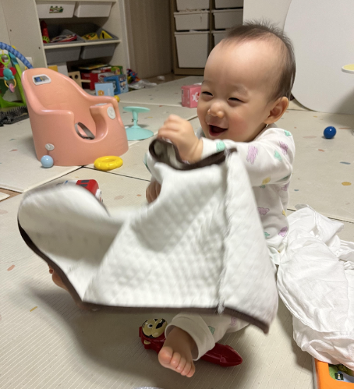 아기가 9개월쯤 되었을까. 마트에서 장을 보고 잠시 저녁거리를 사고 있는데, 유아차에 있던 딸이 혼자 얇은 담요로 얼굴을 가리더니 홱 하고 내렸다고 한다. 나는 그 상황을 보지 못했지만, 남편과 첫째가 똑똑히 목격(!)했다고 한다. 그 후로 딸의 셀프 까꿍 놀이는 계속되었다. 방문을 열었다가 닫으며 숨었다가 나타났고, 또 손에 잡히는 건 무엇이든 (오빠의 내복 바지나 책, 분리수거하려고 꺼내 놓은 종이 등등) 머리 위로 올린 다음 내리기 바빴다.