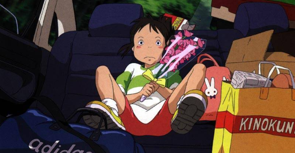 영웅에게 제일 중요한 저편 세계를 탐색하기 전, 먼저 현실 세계를 고찰하자. 영화는 치히로와 부모가 자동차를 타고 이사를 하는 장면에서부터 시작한다. 이사를 하고 새 마을에 들어선 아이들로는 《이웃집 토토로》의 메이와 사츠키 자매가 있었다. 자매가 삼륜 이사 트럭 짐칸에서도 과자를 나눠 먹으며 노래 부르고 즐거웠던 것과 달리, 치히로는 고급차 뒷자석에 타고도 심드렁하다. 이유의 첫 번째는 뒷자석 물건들이 모두 근사한 쇼핑백에 담겨 있고 어떤 것은 ‘기노쿠니야’라고 유명한 서점 로고까지 박혀 있어 모두 비싸다는 것을 알 수 있지만, 그 근처에는 과자 부스러기와 종이 포장지 쓰레기가 뒹굴고 있다. 거기에서 치히로는 드러누워 전학 선물로 받은 꽃 포장지를 만지작거리며 꽃 한 송이 구겨진 것도 불만인 얼굴이다.