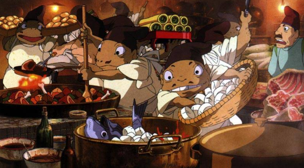 막 가마터에 들어온 센의 눈에는 엄청나게 뜨거운 증기를 쉼 없이 뿜어대는 용광로가 신기하다. 별사탕을 먹으며 작은 몸으로 천근인 석탄을 들어 나르는 검댕먼지도 신비롭다. 그런데 나에게는 그것보다 더 낯설고 기이한 부분이 있다. 바로 가마지의 담배 재떨이, 마셨던 컵, 그리고 너무 읽어서 종이가 부풀어 오른 두꺼운 책들과 중국 도자기, 쉬어야 할 때 할아버지가 마셨을 법한 사기 잔이나 구식 시계이다. 미야자키는 왜 저렇게 많은 디테일들을 가마지의 일터에 배치했는가? 저걸 다 그리려면 도대체 얼마나 많은 컷이 필요한가? 미야자키는 말하고 싶었던 것이다. 저 모든 디테일들은 가마지가 어떤 연유로 온천장 바닥에 있게 되었는지, 그는 어떤 성격을 지녔으며 어떤 취미가 있는지를 암시한다고 말이다. 채찍질로 숯검댕이들을 다그치는 악덕 관리자처럼 보이지만 그는 차를 즐기고 소설책도 읽으며 온천을 돌리는 자기 소임에 대한 책임감에 짓눌리지 않는 인생의 멋과 여유를 아는 일꾼인 것이다.