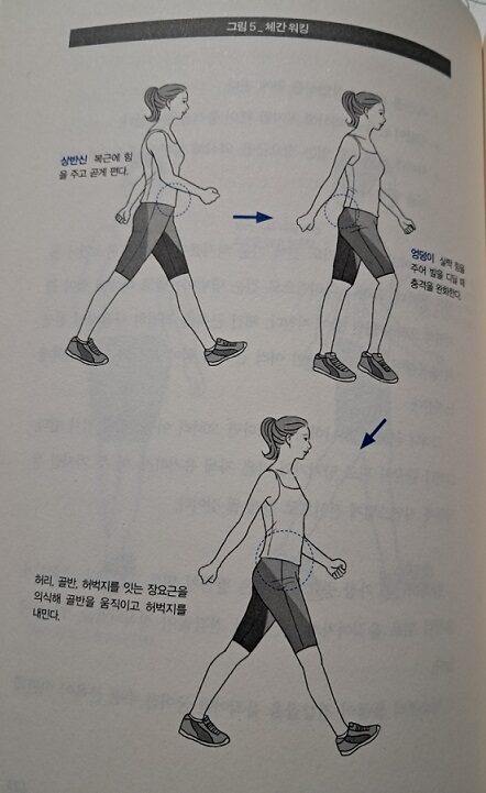 집에 돌아와서 지인이 알려준 유튜브를 검색했다. 걷기혁명이라고 적힌 썸네일을 비롯 기적의 걷기라느니 등등 제목도 현란했다. 그 중에 지인이 알려준 걷기 전문가로 소개된 영상을 찾아서 바르게 걷는 방법을 보았다. 영상에서 알려준 바로는, 발뒤꿈치부터 착지하면서 앞으로 내딛으며 걷는데, 이 때 엄지발가락에 힘을 주면서 평소 보폭보다 10센티 정도 더 크게 걷는다는 기분으로 걸으라고 했다. 체간도 움직여 주라고 했는데, 찾아보니 머리와 팔다리를 제외한 몸통 부분을 가리키는 단어였다. 체간 즉 어깨, 가슴, 배 등의 근육에 적당한 힘을 주고 걸으면, 다리만으로 걷는 방법보다 여러 근육에 힘이 분산되어 편하게 걸을 수 있다고 했다. 방안에서 왔다갔다 따라 해보니 상반신이 좀 더 펴지는 것도 같았다. 뒤꿈치에 힘이 들어가니 아래층이 신경 쓰여 몇 번하다 그만두었다.