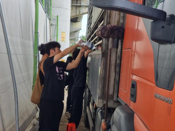 오산역에 도착해서 사람들을 만났다. 비질 모임을 주최한 사이 님2), 새벽이생추어리 활동가들, 개별적으로 비질을 신청한 사람들이 모였다. 어느 신문사의 기자 님3)도 나중에 합류했다. 각자 챙겨온 준비물을 점검했다. 돼지들에게 물을 주기 위한 페트병과 물 분사기, 찐 감자와 고구마를 꺼냈다. 물 조절을 수월하게 하기 위해 페트병 뚜껑에는 작은 구멍을 뚫었다. 처음 만나는 사람들도 있어 약간 어색했지만 분위기는 무겁지 않았다. 지나가는 사람들은 우리를 보고 함께 나들이 가는 청년들 정도로 생각했을지 모른다. 시간이 다 돼서 인원을 체크하고 다 같이 도축장으로 출발했다. 햇볕은 따가웠지만 맑은 날이었다.