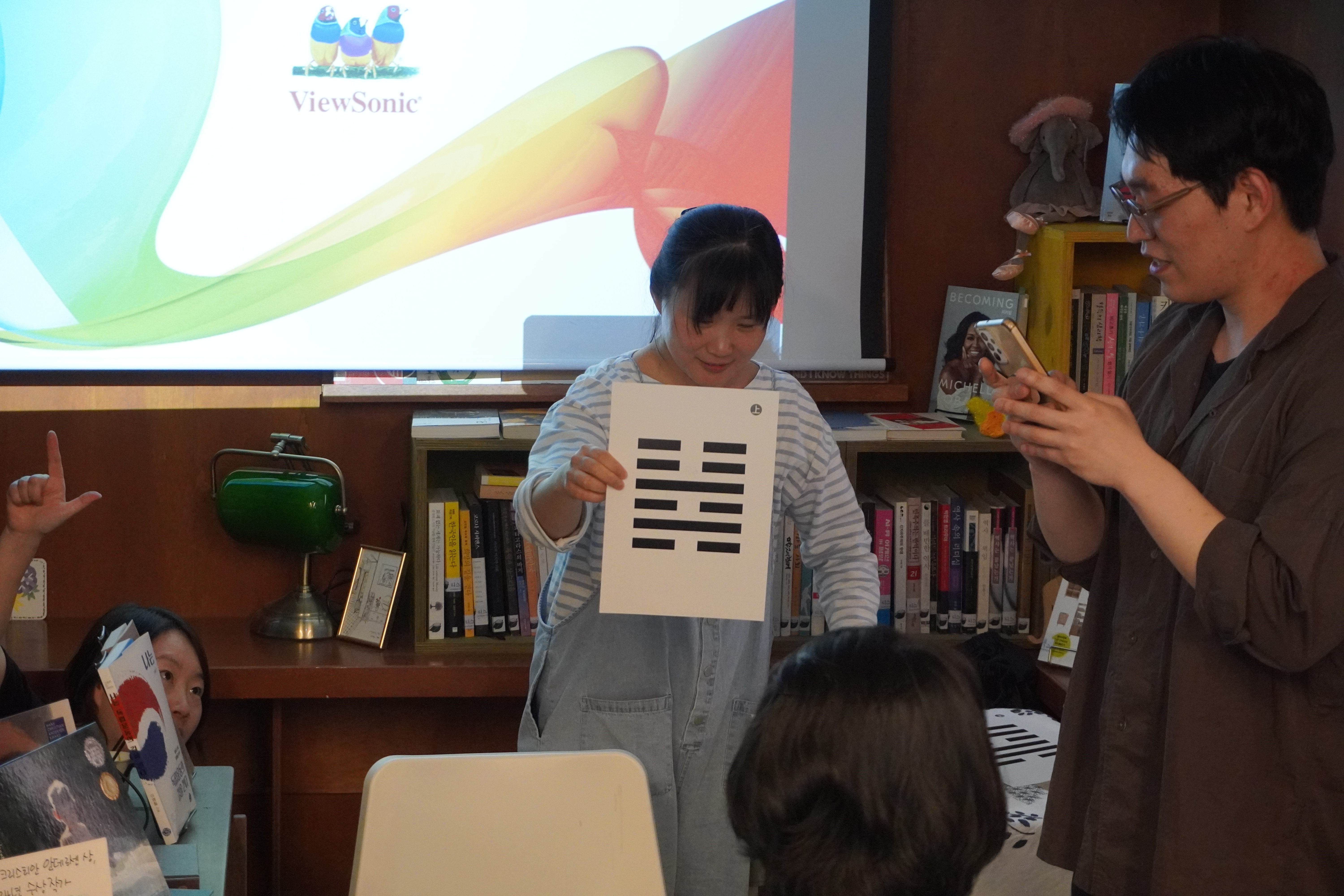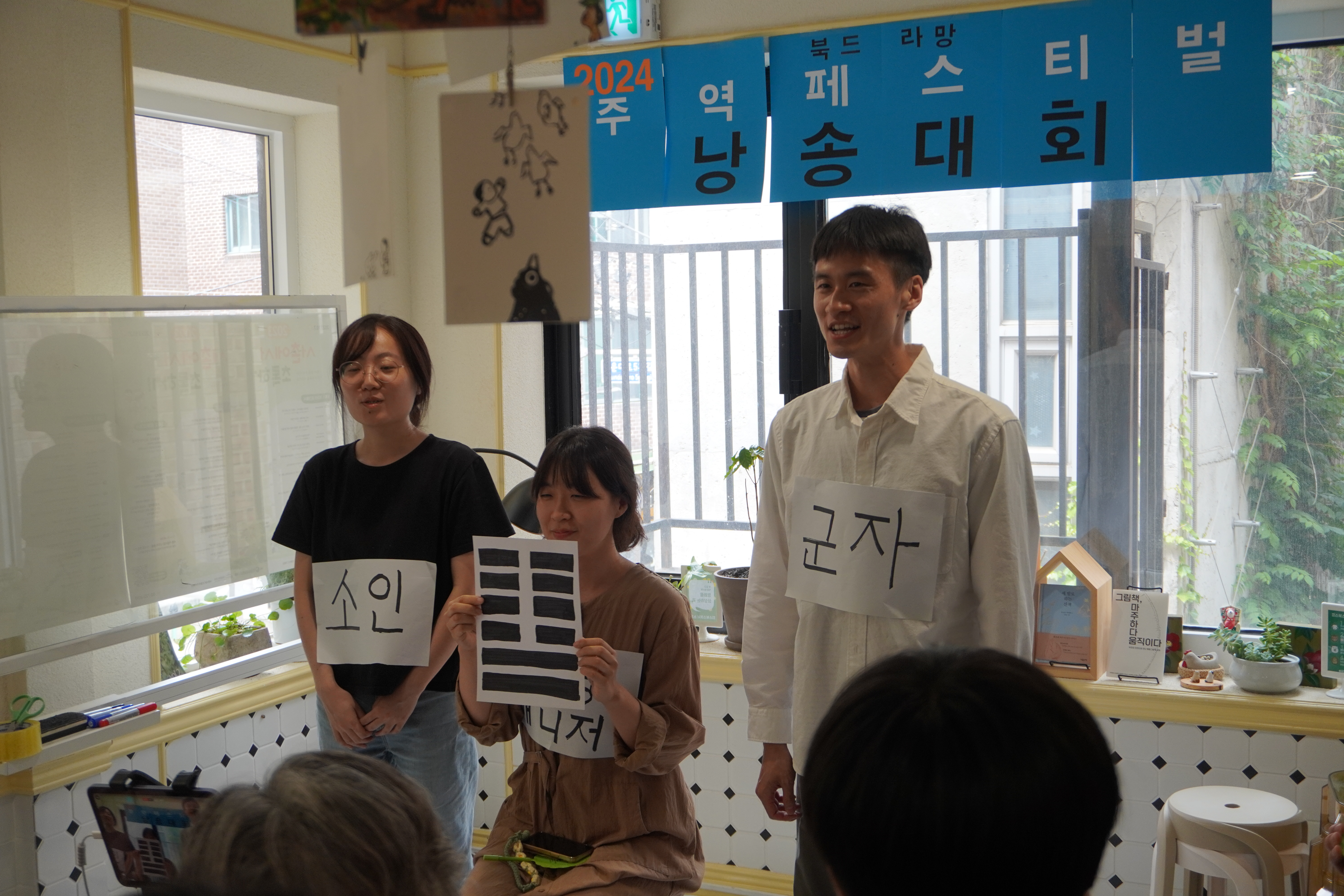 낭송대회 다음에 1층에서는 성태용 선생님께서 '주역 공부를 왜 해야 하는가'라는 주제로 미니 강의를 해주셨는데, 귀에 쏙쏙 들어오는 강의와 유머로 청중을 사로잡으셨습니다. 이 강의는 추후 북드라망 유튜브에 올라올 예정이니, 구독 눌러 주시고 기다려 주세요. 그리고 이때 2층에서는 문탁넷의 자누리 선생님께서 시초점 시연을 보여 주셨습니다. 말로만 듣던 시초점을, 자누리 샘의 탁월한 설명과 함께 직접 볼 수 있었습니다.