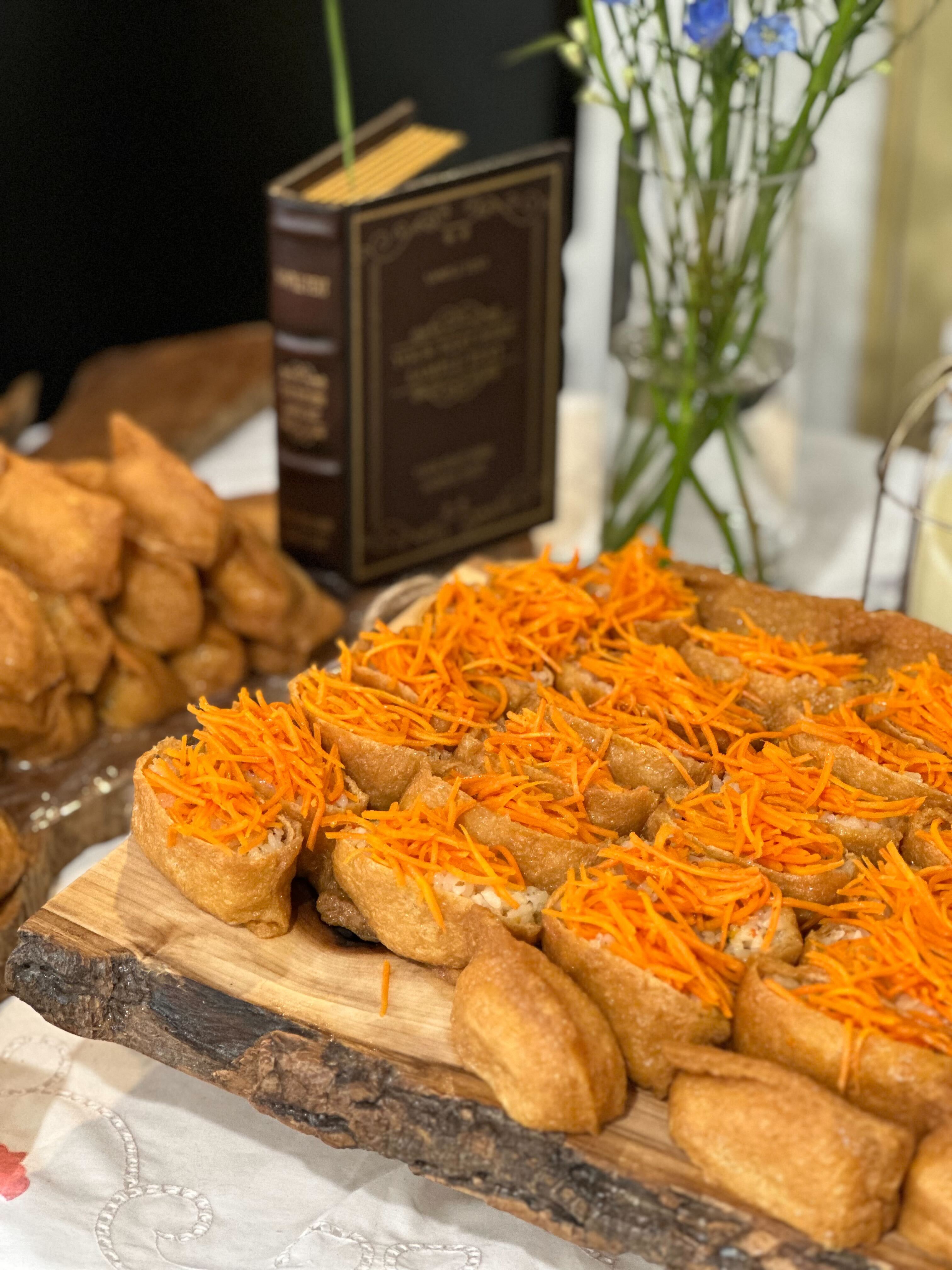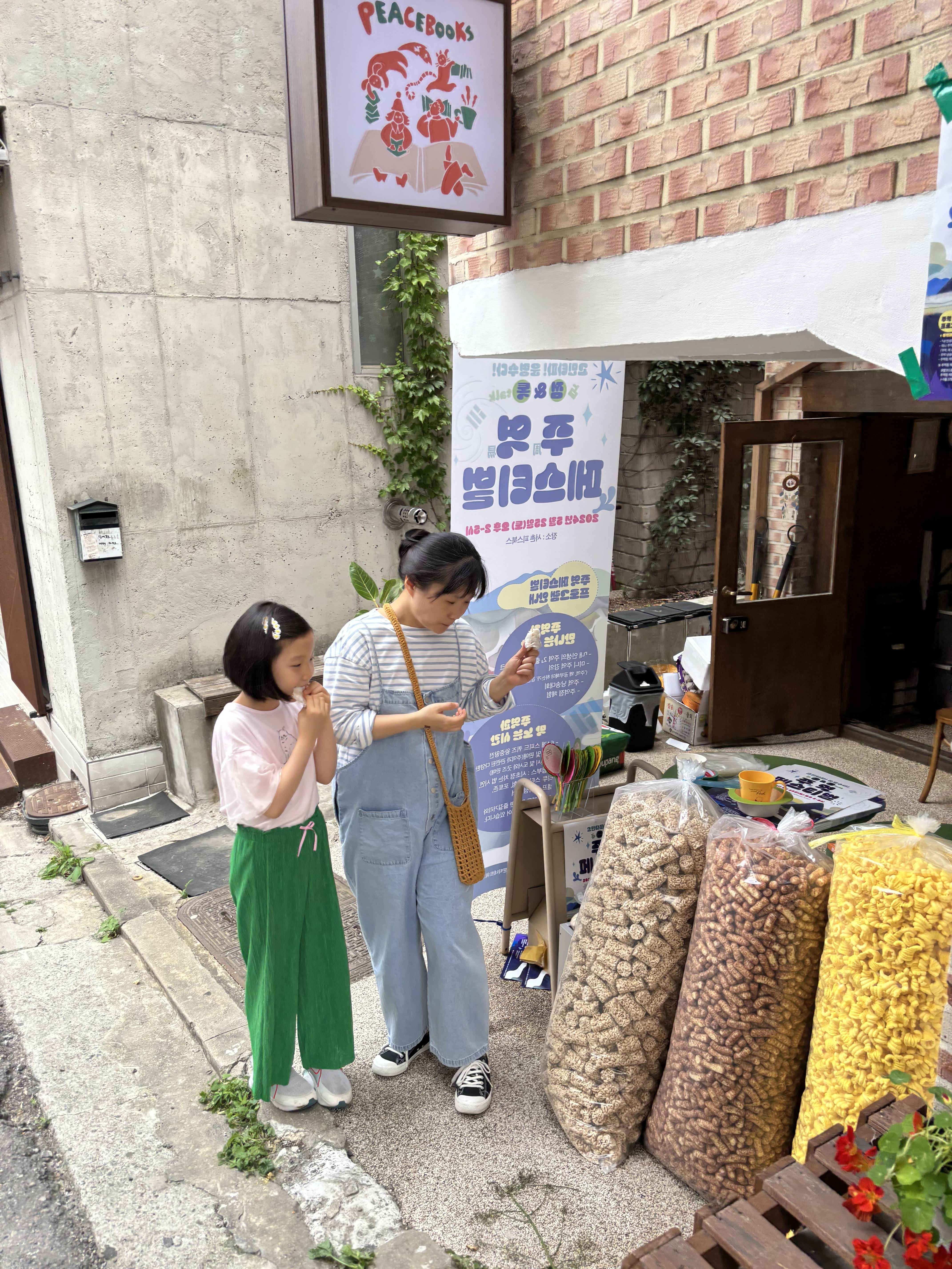 이번 행사에 저희가 야심차게 준비한 웰컴간식(!)은 뻥튀기였는데요, 둥근 뻥튀기 위에 여러 종류 다른 뻥튀기를 얹어 드리고, 둥근 뻥튀기는 행사장 내에 비치된 유부초밥을 드실 앞접시로 쓰시도록 했습니다. 그리고 부채 볼펜을 선물로 드렸는데요, 뒷면에는 당일 행사 내용을 적어 놓았습니다.
