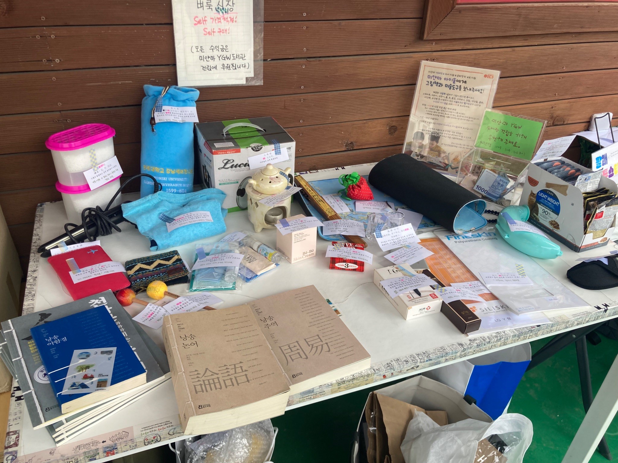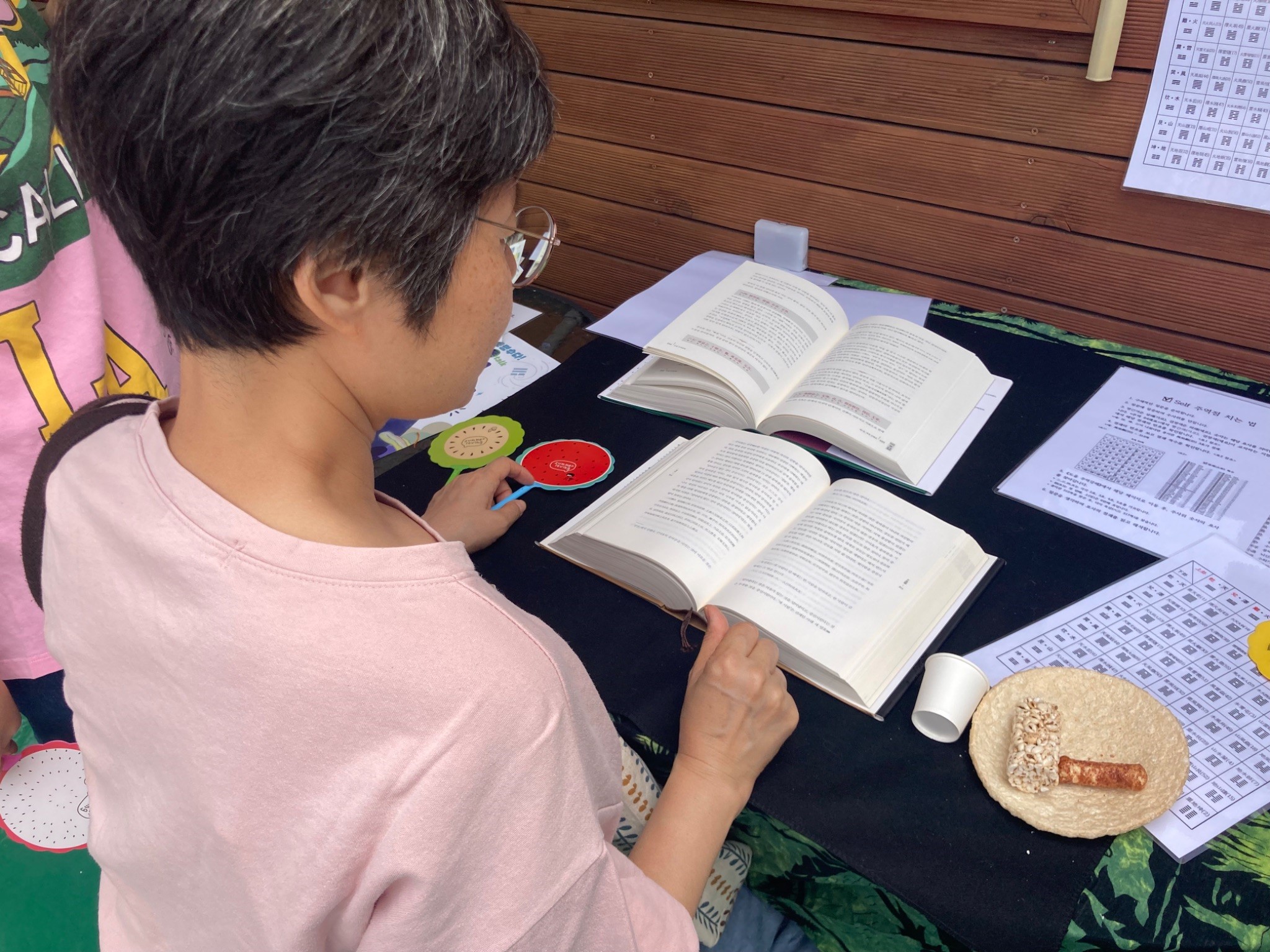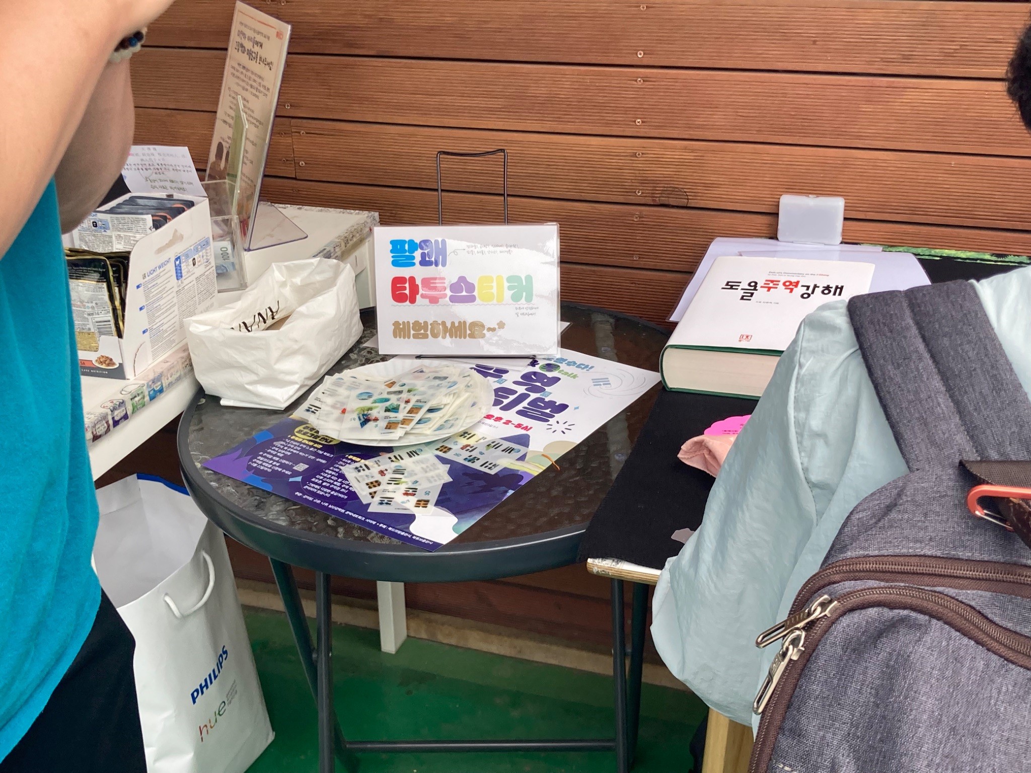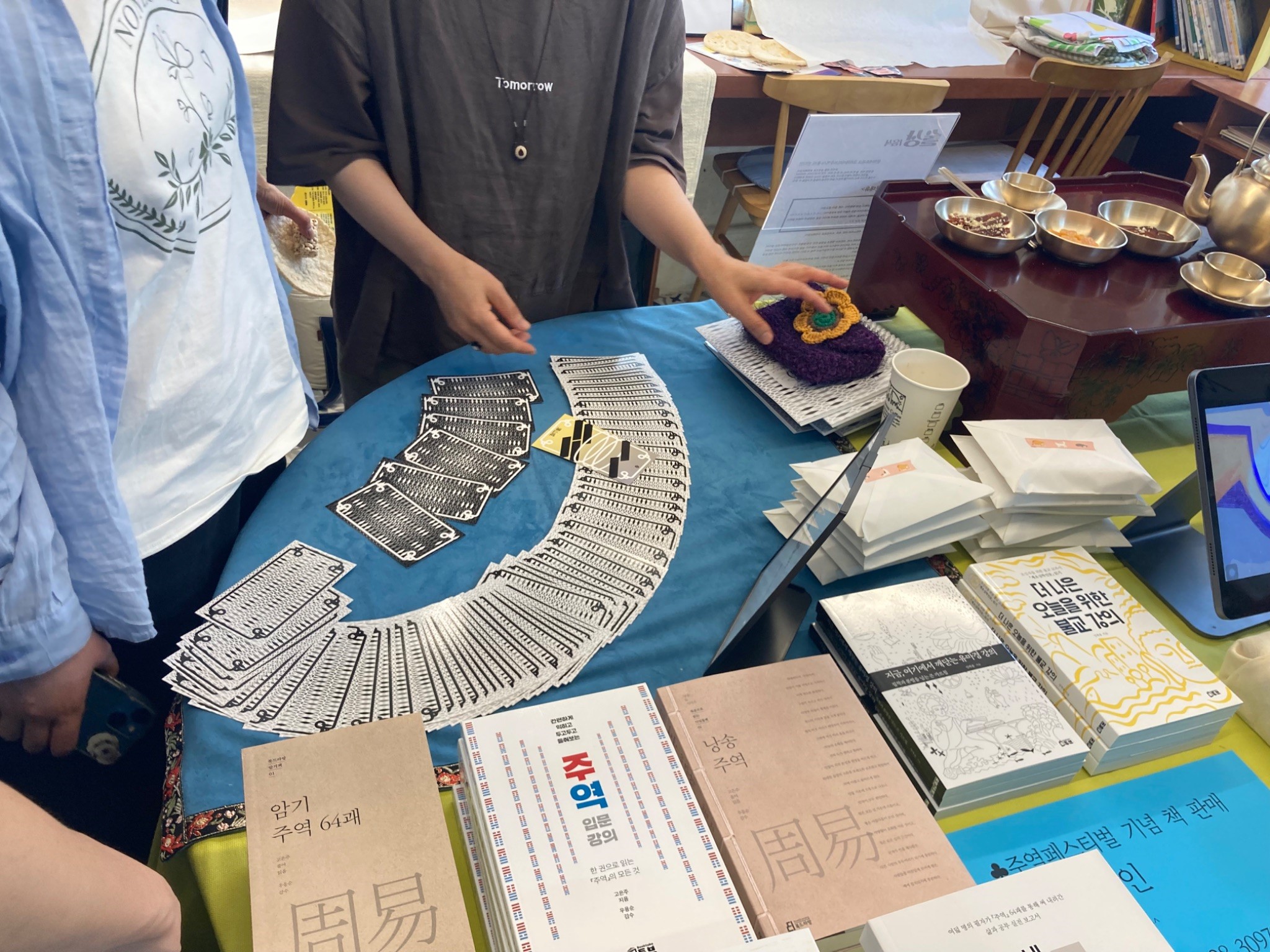 그렇게 3층의 로이차를 지나쳐서 밖으로 나가면 옥상이 펼쳐집니다. 셀프 주역점 코너가 옥상 입구에 있습니다. 주역에서 가장 하이라이트는 주역 점이 아닐까 생각해보는데요! 미리 신청하지 못해서 아쉬워할 새 없이 옥상에서 책을 펼쳐보며 스스로 점을 쳐보는 것입니다. 옥상 입구에 있어서 그런지 지나다니는 사람들의 이목을 집중시켰습니다. 그리고 옆으로는 주역 점으로 만든 타투 스티커와 중고 장터가 있었습니다. 타투 스티커는 안 한 사람을 찾는 게 더 빠를 정도로 귀여운 그림들이 타투 스티커를 하고 싶게 만들었습니다! 중고 장터에서는 금액을 구매자가 정하는 시스템이었습니다 ~! 또한 기부로 이어진다고 하니 마음에 드는 게 있다면 주저하지 않고 고르게 되더군요. 그리고 주역페스티벌답게 구매하는 물품에는 주역괘 설명이 함께 적혀져 있었습니다. 일상적으로 경험하고 있는 당연한 활동에 주역이 자연스레 추가될 수 있다는 사실이 굉장히 재밌었습니다.