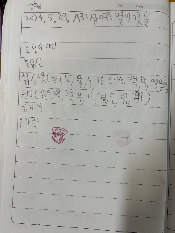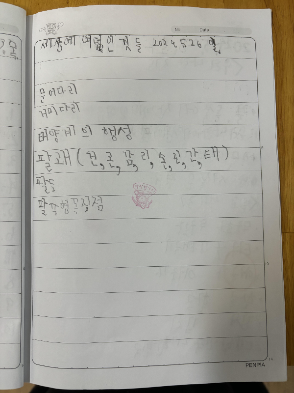세상에 넷인 것들까지는 비교적 수월했는데, 세상에 다섯인 것들부터는 좀 고민이 필요했다. 엄마 아빠랑 같이 생각하면서 공책에 써갔는데....