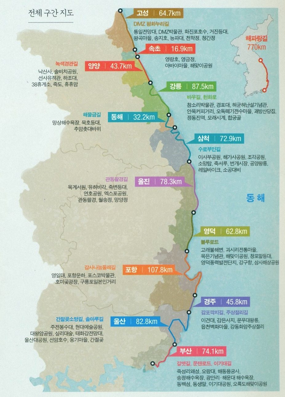 그렇지만 나는 하던 일을 때려치울 자신이 없었기 때문에 그 다짐은 서서히 잊혔다. 시간이 지나 인문학공부를 하게 되면서 다른 일상으로 접어들었고, 타고 다녔던 승용차를 처분했다. 집을 나서서 걷는 일이 점점 많아졌다. 그사이 걷기가 점점 더 많은 이들의 관심 영역으로 떠올랐다. 제주도 올레길이나 산티아고 순례길 등을 걷는 이야기들이 더 자주 들려왔다. 시코쿠 순례길을 알게 되었을 때처럼 끌리지는 않았다. 그러다 고향집을 통과하는 해파랑길을 알게 되었다. 한국에서 가장 긴 트레일 코스로 50개 코스로 이루어진 750km의 길이었다. 고향집 주변 코스부터 몇 코스를 걷기 시작하면서 다시 예전의 그 다짐이 떠올랐다. 나도 한번 해 봐야지.