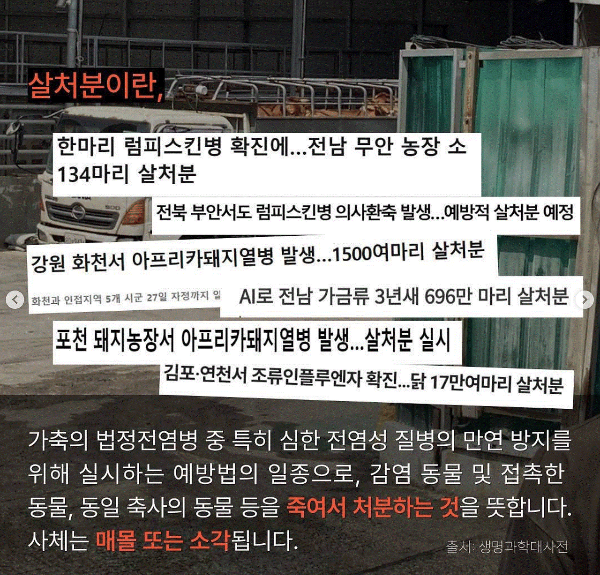 사회자 : 9월 20일, 이탈리아 경찰이 생추어리에 침입해, 그 곳의 거주민은 돼지들을 살해했습니다. 아프리카돼지열병이 발병하여 ‘살처분’을 시행한 것입니다. 현재 소 농가에서는 ‘럼피스킨병’이라는 전염병이 돌고 있습니다. 대한민국은 이번에도 살처분이라는 방법을 택했으며, ‘한우와 원유 수급 영향’을 염려합니다. 몇 일 전, AI, 즉 조류인플루엔자가 발생했고, 국가는 수많은 조류들을 살처분했습니다. 살처분은 육상동물부터 수생동물까지, 축산동물부터 수산동물, 실험동물, 야생동물, 동물원에 감금당한 동물들까지, 모든 비인간동물을 대상으로 시행됩니다. 생매장(매몰), 가스 살해, 독살, 폭행으로 인한 살해, 전기 도살 등, 다양한 방식으로 시행됩니다.