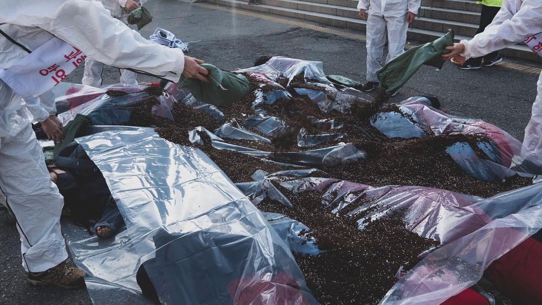 "안녕하세요. 저는 오늘 살처분 반대 액션에서 살처분 당하는 동물로 참여한 인간 동물입니다. 저는 조금 전에 방역복 입은 인간에게 끌려가서 비닐이 덮여진 구덩이에 던져졌습니다. 제 몸 위로 흙이 마구 쏟아졌고 저는 숨이 막혀 고통 속에 비명을 질렀습니다. 그리고 영문도 모른 채 죽음을 맞이해야 했습니다.