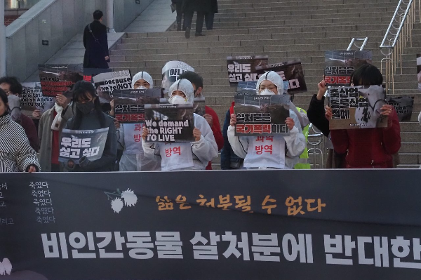 저는 그들의 죽음이 나의 생존과 분리될 수 없기에 이 자리에 섰습니다. 저는 이 자리에서 동물들이 내지르는 비명 소리를 듣습니다. 그들이 끝까지 몸부림치며 저항하는 모습을 봅니다. 이 세상에 죽여도 되는 동물은 없기에, 땅 속에 처분된 그들의 죽음을 기억하며, 저는 가축 동물들의 살처분에 반대합니다. 그리고 새로운 삶의 조건을 함께 만들어가기 위해, 여러분의 관심과 행동을 촉구합니다."