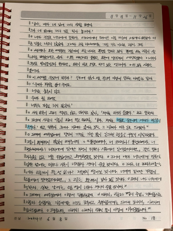 네, 그러니까, 뭘 필사한 것이냐 하면, 바로 성경입니다. 여기서 자세한 사연을 풀어놓을 수는 없지만 어쨌든 저는 지금 천주교의 예비자 교리 과정을 밟고 있는데요(천주교 신자는 그냥 되지 않습니다. 6개월가량의 예비자 교리를 받고, 세례를 받아야 천주교 신자가 되는 것이랍니다), 성경 필사는 올 8월 말까지 마쳐야 할 숙제입니다. 40대 중반에 성경을 필사하고 있는 저의 모습이라니… 제가 하고 있기는 하지만 정말이지 언빌리버블!
