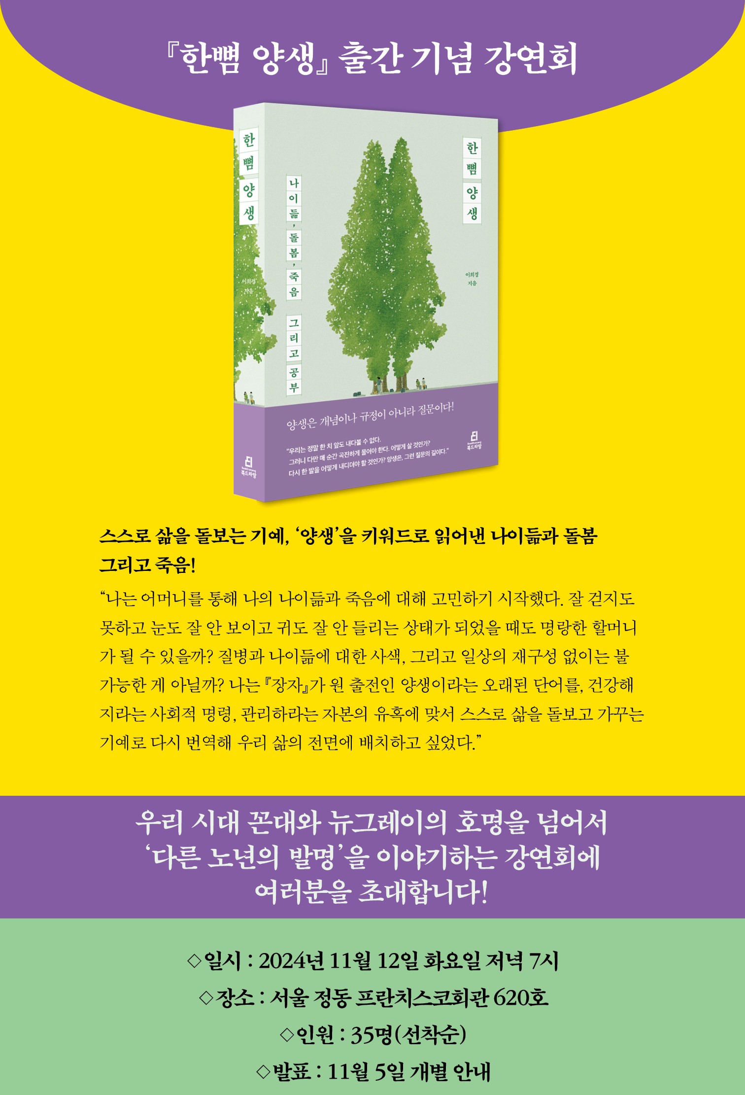 | 꼰대와 뉴그레이의 호명을 넘어 ‘다른 노년의 탄생’에 대한 이야기―『한뼘 양생』 저자 강연회가 열립니다(오프라인, 서울 정동)! (0) | 2024.10.30 |