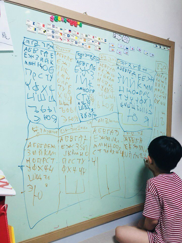 또 남달랐던 점은, 감자는 뭔가 한 번 좋아하기 시작하면 끝장을 보는 스타일이라는 점이다. 국기가 그랬고, 나중에는 미세먼지 수치, 키릴 문자, 국제 음성기호 등 뭔가 기호같이 생긴 것들을 좋아했다. 미세먼지에 빠졌을 때는, 매일 미세먼지 수치를 체크하고, 국제 규약(?)의 차이점을 들여다보고, 노래까지 만들어 불렀더랬다. 그러다가 러시아 키릴 문자에 빠진 시절이 있었는데, 그땐 또 천잰 줄 알았더랬지. 러시아 키릴 문자와 우크라이나 문자와 몽골어, 카자흐어 등 그쪽 지방 문자들이 내가 보기엔 다 비슷해 보이는데, 나라마다 비슷하면서도 다른 문자 체계를 가지고 있었다. 그것들의 차이와 공통점을 찾아내는 것을 굉장히 좋아했다.