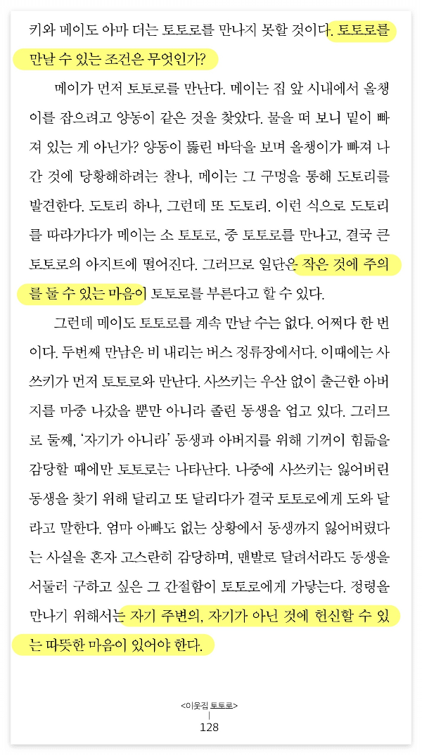 미야자키의 애니를 보면서, 오선민 선생님의 글을 따라가면서, 살아생전 오무나 거신병(얘가 아무리 꽃을 가꾸고 그런다고 해도)을 만나고 싶진 않지만(흠흠), 토토로를 만나고 싶다, 만날 수 있을지도 모른다, 라는 생각을 했습니다(조금 두근두근하기도 했다면, 지천명을 앞두고 주책일까요;;). 힌트는 『미야자키 하야오와 일상의 애니미즘』 128쪽에 있는데요, 살짝 보여 드리자면…,