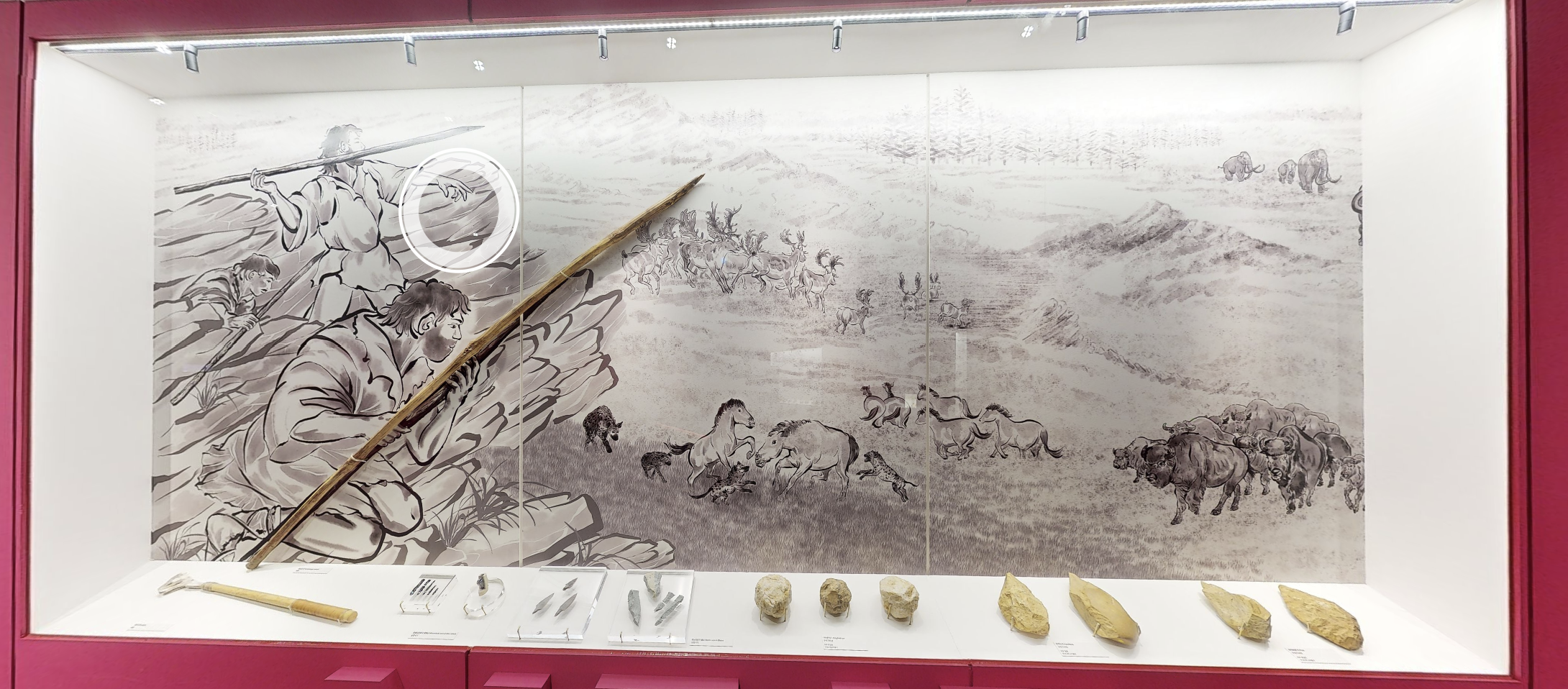 ‘반드시 잡아라’라는 전시물은 두 부분으로 구성되어 있다. 하나는 전면에 제시되어 있는 커다란 수묵화이고, 다른 하나는 수묵화 바닥에 가지런히 놓여 있는 사냥도구(石器)들이다. 화면에서 재현된 선사의 사냥 장면이 기가 막힌다. 사냥꾼이 창을 들고 높은 언덕 위에서 매머드, 야생 들소, 사슴, 말과 하이애나 등을 내려다보며 겨냥하고 있다. 멀리 보이는 동물들은 원근법 때문에 작게 표현되어 있다. 다행히 동물들을 지나치게 왜소화시키지는 않았다. 오른쪽 하단의 들소들은 눈매에 살기가 어려 있는 듯도 하다.