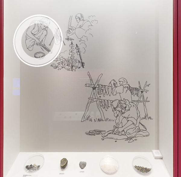 먹거리라는 물질과 의미라는 정신이 서로 섞여 들어가기 위해서는 불이라는 변용과 화합의 물질이 필요하다. 〈고기전〉에서 차마 눈 뜨고 보지 못할 ‘돼지고기 발골’의 동영상을 지나면, ‘고기의 풍미’에 대해 소개하는 그림과 그 밑으로 화덕에 놓였던 구워진 돌이나 탄화된 곡식이 있다. 그림에는 꼬챙이에 고기를 끼워 불에 굽는 장면이 있다. 인류는 불을 언제부터 다룰 수 있게 된 것일까? 불 자체는 인간의 발명품이 아니지만 불을 길들이는 기술은 인간의 발명품이다.