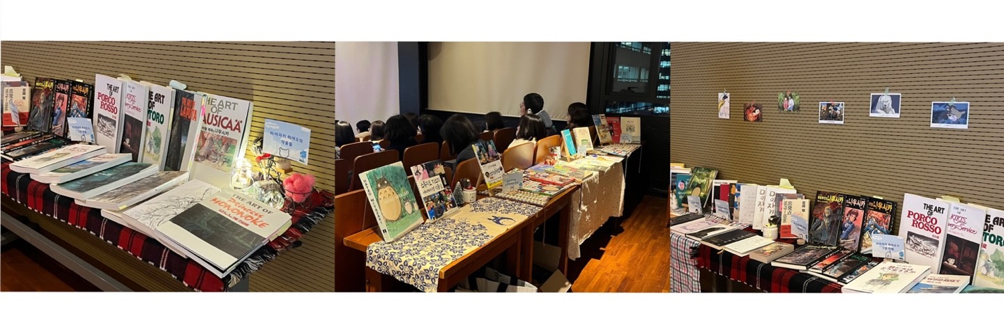 북토크 강연장인 체칠리아 홀의 입구에는 오선민 선생님께서 참고한 책들이 전시되었습니다. 미야자키의 숲과 비행과 먹음 주제의 책, 미야자키 작품들의 아트북, 미야자키에게 영향을 준 문학 작품들, 지브리 스튜디오 소개 책자, 작곡가 히사이시 조의 책, 『바람의 계곡 나우시카』 만화로 거의 백 여권에 이릅니다. 오선민 선생님께서 이번 북토크는 덕후들의 대잔치가 될 것이라 하셨는데 세상을 향한 미야자키의 따뜻한 시선이 담긴 수많은 스케치와 작화들과 함께 하니 더 좋았습니다.