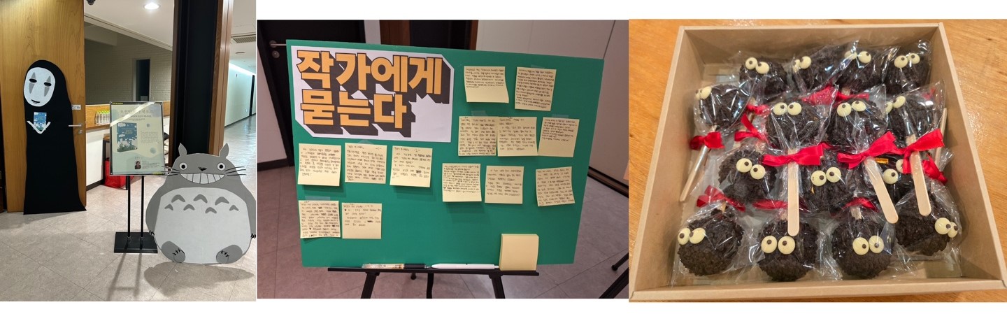 12월 11일 오선민 선생님의 『미야자키 하야오와 일상의 애니미즘』(이하 『일상의 애니미즘』) 북토크가 정동 프란치스코 교육회관에서 열렸습니다. 미야자키 하야오의 작품을 ‘애니미즘’으로 해석한 오선민 선생님 책의 기운 때문이었을까요? 한마디로 애니미즘적 활기가 넘치는 북토크였습니다. 토토로와 가오나시 등신상과 마구로 쿠로스케 과자 간식이 등장하였습니다. 연주선생님 모녀는 키키의 빨간 머리띠를 장착하였고, 수정 선생님은 『천공의 성 라퓨타』의 파즈처럼 캐츠비 베레모 모자를 썼으며, 혜영 선생님은 『모노노케 히메』의 원령공주를 따라 털조끼를 입고 왔습니다. 가장 인기가 있던 것은 토토로와 가오나시 등신상으로 그 앞은 자연스레 포토존이 되었습니다. 이 등신상을 어디서 공수해왔는지 문의가 이어졌는데요. 인문공간세종의 기술자인 기헌선생님께서 자체 제작하신 것입니다. 나중에 다 같이 모여 찍은 단체 사진을 봤는데 가오나시가 정말 살아서 우리와 함께 사진을 찍은 것 같았습니다.