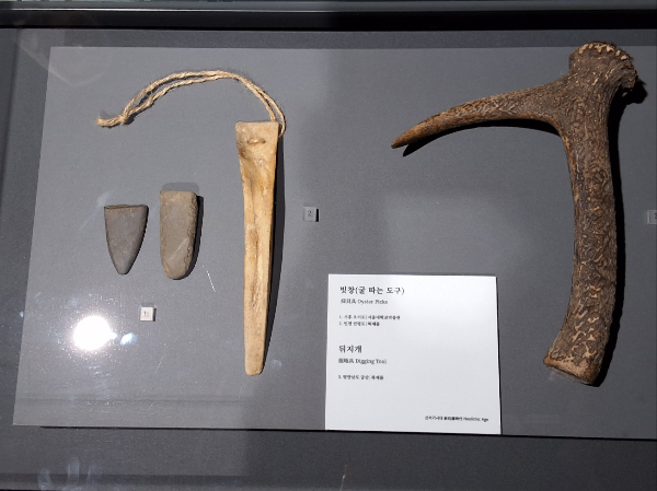 서해의《시흥 오이도 박물관》과 동해의《오산리 선사유적 박물관》에서는 해조류와 갑각류 채집의 도구와 그에 따른 기술을 공부할 수 있다. 오이도에서 시작해보자. 패류의 채취는 조개의 서식 환경에 따라 달라지는 것 같다. 소라, 피뿔고둥 등 맨손으로 채취할 수 있는 것도 있지만 굴, 전복, 삿갓조개 등은 암초에 붙어살기 때문에 손으로는 뗄 수 없어 빗창이나 망치가 필요하다. 《시흥 오이도 박물관》에는 당시에 채집했을 다양한 전복류와 전복 채취 도구 빗창과 뒤지개가 전시되어 있다. 전복은 평소 마트에서 보던 것보다 훨씬 크고, 그 껍질도 무슨 중생대 공룡같이 무시무시하다. 도구로서는 특히 빗창이 눈길을 끈다. 동물뼈(아마도 사슴뼈?)로 깎았을 것 같은데 그것을 쥔 손도 떼어질 전복도 다치게 하지 않을 정도의 탄력성과 그러면서도 자신은 부서지지 않을 정도의 내구성을 가진 날렵함이 인상적이다. 사슴뿔로 만든 뒤지개 역시 뿔의 모양을 살린 채집 도구인데, 숲속을 걸어가는 사슴을 보고 전복을 뜯을 생각을 했을 오이도인들의 자유자재한 상상력이 놀랍다.