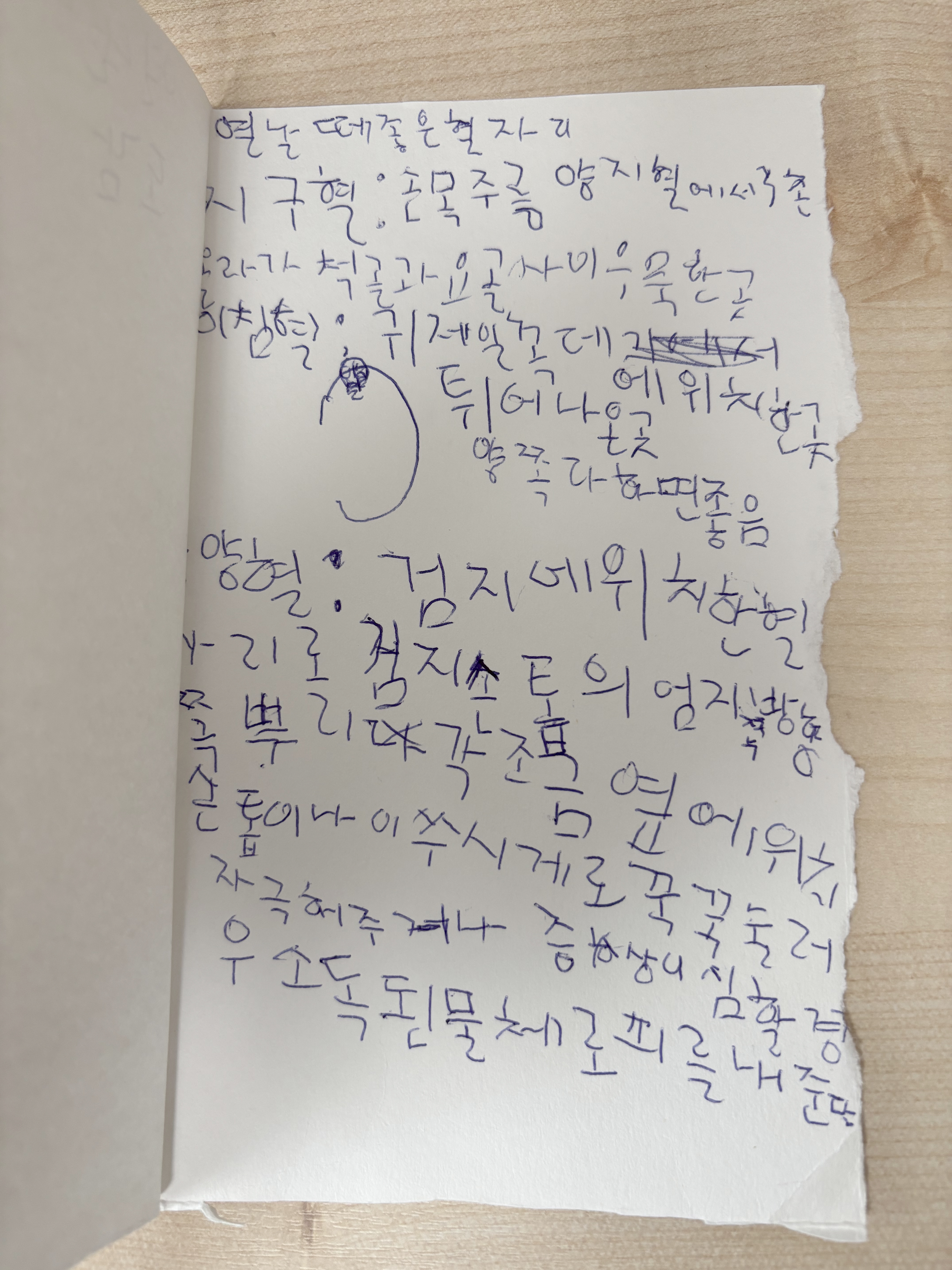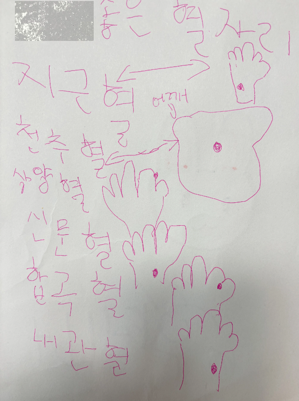 그걸 옆에서 늘 보고 자란 아이는 이제 글을 읽을 수 있게 되자 엄마가 어딘가 안 좋은 기색이면 내 핸드폰을 빌려 달라고 하고는 혈자리를 찾아본다.^^ 최근에는 갑자기 열이 나서 누워 있었는데, 옆에 와서 귀찮게도 안 하고 뭘 꿍짝꿍짝 하는 것 같더니, 저렇게 팸플릿(?)을 만들어 왔다(아빠 핸드폰을 빌려서 찾았단다). 하하.