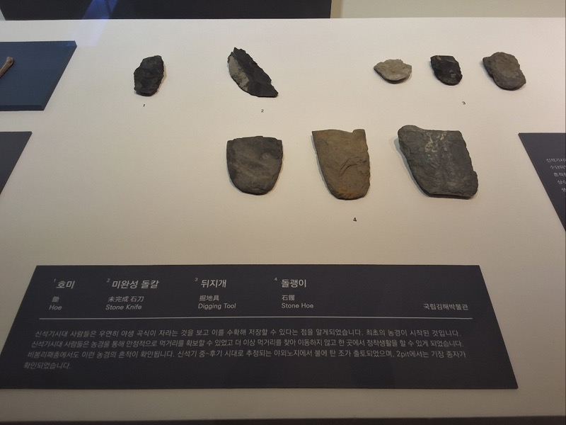 비봉리에서는 다양한 탄화 곡식과 다양한 농기구 파편도 발견되었다. 이 농기구들을 보면 전부 아래가 뭉툭하다. 주먹도끼에서부터 흑요석에 이르는 도구의 날카로움은 둥글고 부드러운 형태로 바뀌어 있었다. 그런 토기들 사이에서 보니 비봉리의 흑요석은 더 작다. 이처럼 작아진 흑요석은 숲의 동물들과 맺는 관계가 달라졌음을 암시하는 듯하다. 흑요석의 자리를 대신한 것이 비봉리의 호미, 뒤지개, 돌괭이였을까?