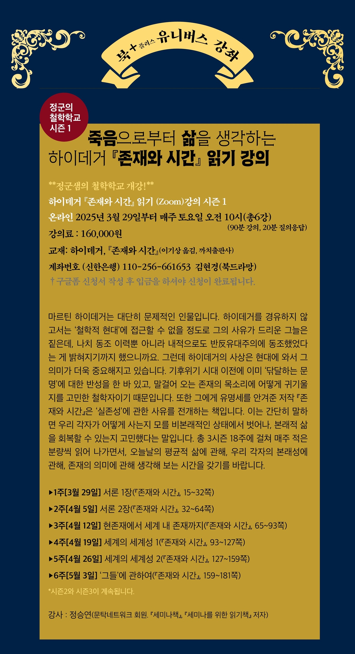 | 북플러스 유니버스―하이데거의 『존재와 시간』 강의 시즌2가 시작됩니다! (0) | 2025.05.02 |