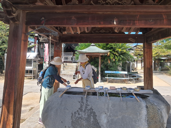순례 넷째 날은 마쓰야마에 위치한 53번 절 원명사에서 시작했다. 절의 산문을 들어서면 우선 미즈야(水屋)라는 곳에서 손과 입을 헹군다. 졸졸 흐르는 물이 넘치는 통(돌이나 나무로 만든)위에 자루가 긴 바가지가 걸쳐져 있다. 처음에는 식수인 줄 알고 마셨다가 나중에야 산문에 들어선 순례자가 입을 헹구고 손을 닦는 정화 의례를 하는 곳이라는 것을 알게 되었다. 그 다음에는 종을 치는 찰소로 가서 종을 치면서 자신의 방문을 고한다. 이것도 순례자들이 하는 것을 보고 알게 되었다. 본당 앞에 비치된 장소에 양초와 향을 올리고 참배를 한 후, 본당을 참배하고 불경을 낭송한다. 이어서 홍법대사를 모셔둔 대사당을 참배하고 나서, 납경소로 가서 납경을 받으면 절에서의 하는 순례 의례가 끝난다. 눈으로 보기만 하다가 직접 해 보니 점점 자세가 경건해졌다.