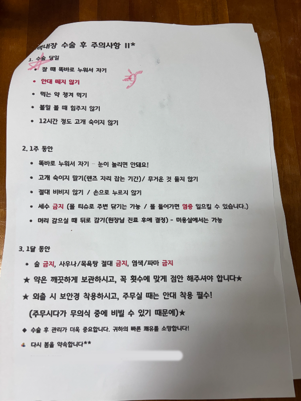 수술 자체는 20여 분 정도. 수술 후 한 달 정도 조심하는 것이 관건이다. 열흘 정도는 머리 감기도 숙여서 하지 말고, 미용실 등에서 머리 감듯 뒤로 젖혀서 하길 권고하고, 잘 때에 반드시 보호대를 하라고 권고한다. 어머니가 5년 반 전 돌아가신 후 아버지 혼자 사신다. 스무 살 무렵부터 사회생활을 해오면 이것저것 경험 많은 아버지이시지만, 집안일과 관련해서는 서툰 편이시고, 그걸 아니 걱정되는 부분이 많다. (다행히 엄마가 돌아가시기 전 아버지를 짧은 기간 청소하기, 세탁기돌리기, 밥하기, 간단한 반찬하기 등을 훈련(?)시켜 두셔서 한시름 덜었지만.)