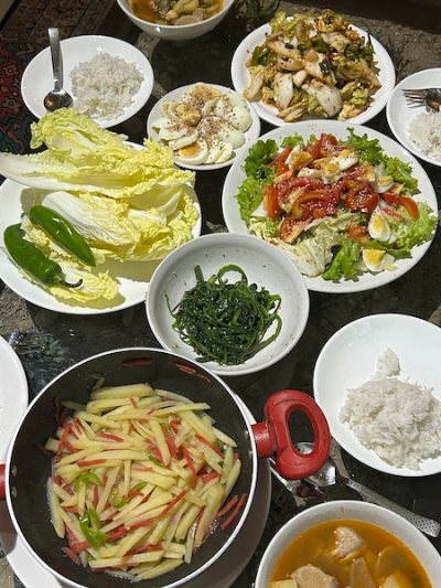 어머니 일행이 지내셨던 숙소는 취사가 가능한 곳이라 이모와 어머니는 근처에서 장을 보고 밥을 숙소에서 곧잘 해 드셨다. 그런데 두 K-주부들의 음식 퀄리티가 청년들은 감히 상상할 수 없을 정도였는데, 세상에 여행하는 도중에 김치를 직접 담가 먹는 사람은 처음 봤다. 살림을 한다는 건 이역만리 타지에 와서도 한식 레스토랑을 차릴 정도의 능력을 갖춘다는 것이구나, 라며 감탄했다. 그것도 한창 관광을 하고 와서 피곤한 와중에도 딸내미들을 잘 먹이겠다는 마음에서였으니, 정말이지 세상의 모든 어머니들은 위대해! 그래서 결국 가이드 일한 것보다도 더 큰 김치통 보시를 받아버렸다는 이야기. 그런 그들의 마음 덕분에 오늘도 다람살라 생활은 더욱 할 만한 것이 된다.