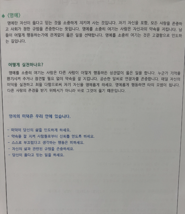 그 가운데 하나가 '명예'인데, 매주 받는 안내문에 명예는 이렇게 써 있었다.